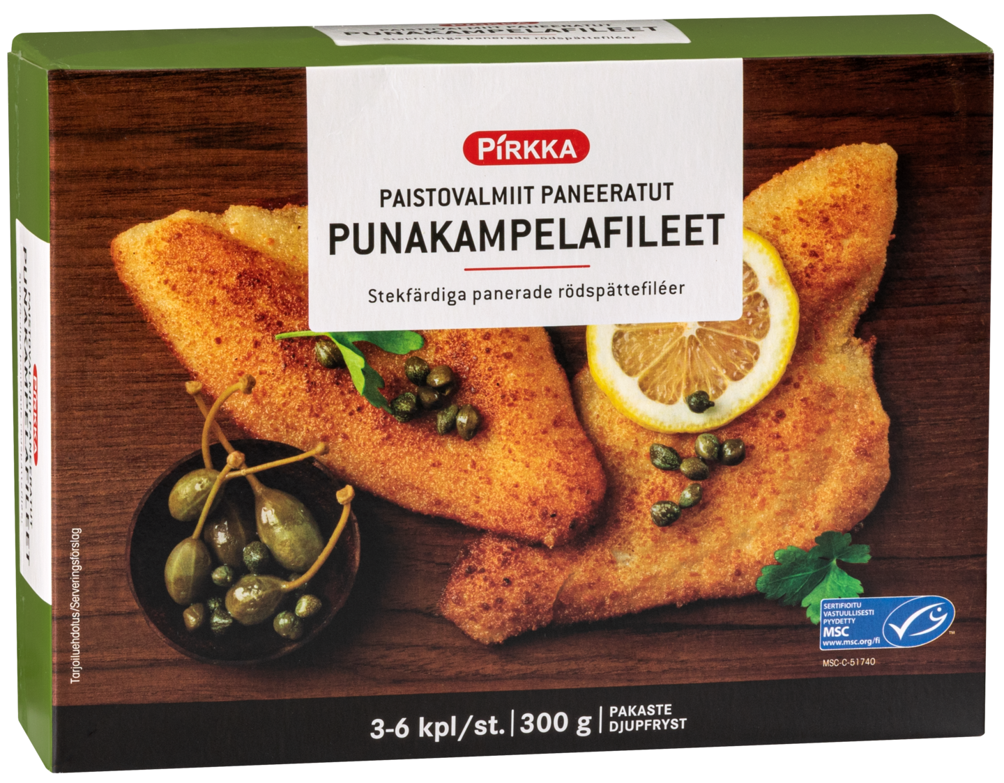 Pirkka punakampelafileet ovat ohuesti paneroituja. Ne paistetaan pannulla herkullisen rapeiksi. Tarjoa esimerkiksi perunasoseen ja salaatin kanssa. MSC-sertifioitu.