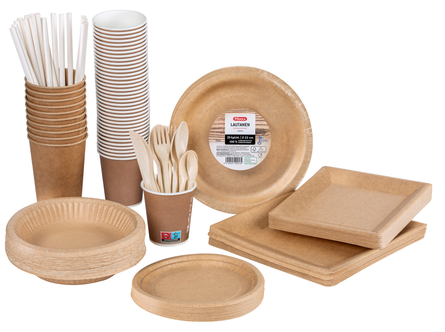 Pirkka uudelleenkäytettävä ja uniikki, täysin puupohjaisesta ja uusiutuvasta luonnonmateriaalista valmistettu konepesunkestävä puukuituhaarukka. Pirkka puukuitupohjaiset kestoaterimet valmistetaan uudesta, täysin puupohjaisesta biokomposiitista, joka on seos havupuukuitua (60%) ja mäntyöljypohjaista ISCC sertifioitua biopolypropeenia (~40%). Raaka-aine on valmistettu hyödyntämällä olemassa olevan suomalaisen metsäteollisuuden sivuvirtoja, eikä näin ollen itsessään aiheuta metsähakkuita eikä tuotteissa käytetty puupohjainenmuovi tai mäntyöljypohjainen muovi kilpaile ruokatuotannon kanssa, kuten monet muut biopohjaiset muovit. Tuotteen ominaisuudet ovat myös aivan uudella tasolla tarjoten esim. erittäin jäykän rakenteen, konepesunkeston, korkean lämpötilakeston (+100), aterimet myös soveltuvat mikrolämmitykseen ja tarjoavat miellyttävän suutuntuman ilman ylimääräisiä makuja. Tuotteet ovat myös vahvempia ja tukevampia ja niiden hiilijalanjälki (CO2) on n. 90% pienempi kuin perinteisillä kertakäyttöaterimilla. Elinkaarensa lopussa voidaan tuote hyödyntää energiajakeena, jolloin raaka-aineen hiilijalanjälki jää neutraaliksi. Aterimet ovat Suomessa valmistettuja Avainlipputuotteita ja ne on testattu EN12875-1 standardin mukaisesti konepesun kestäviksi. Pirkka kestoaterimien elintarvikekontaktin turvallisuus on varmistettu viimeisten EU-säädösten mukaisesti.