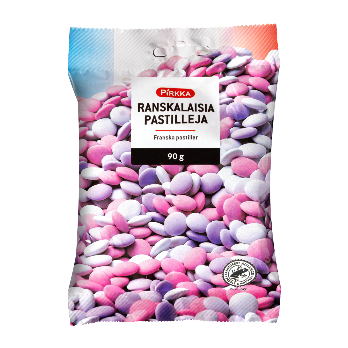 Pirkka ranskalaiset pastillit ovat piparmintun makuisella kuorrutteella päällystettyjä suklaamakeisia. Makeiset sopivat sellaisenaan herkutteluun ja myös leivonnaisten koristeluun. Suklaan valmistuksessa käytetty kaakao on Rainforest Alliance -sertifioitua.