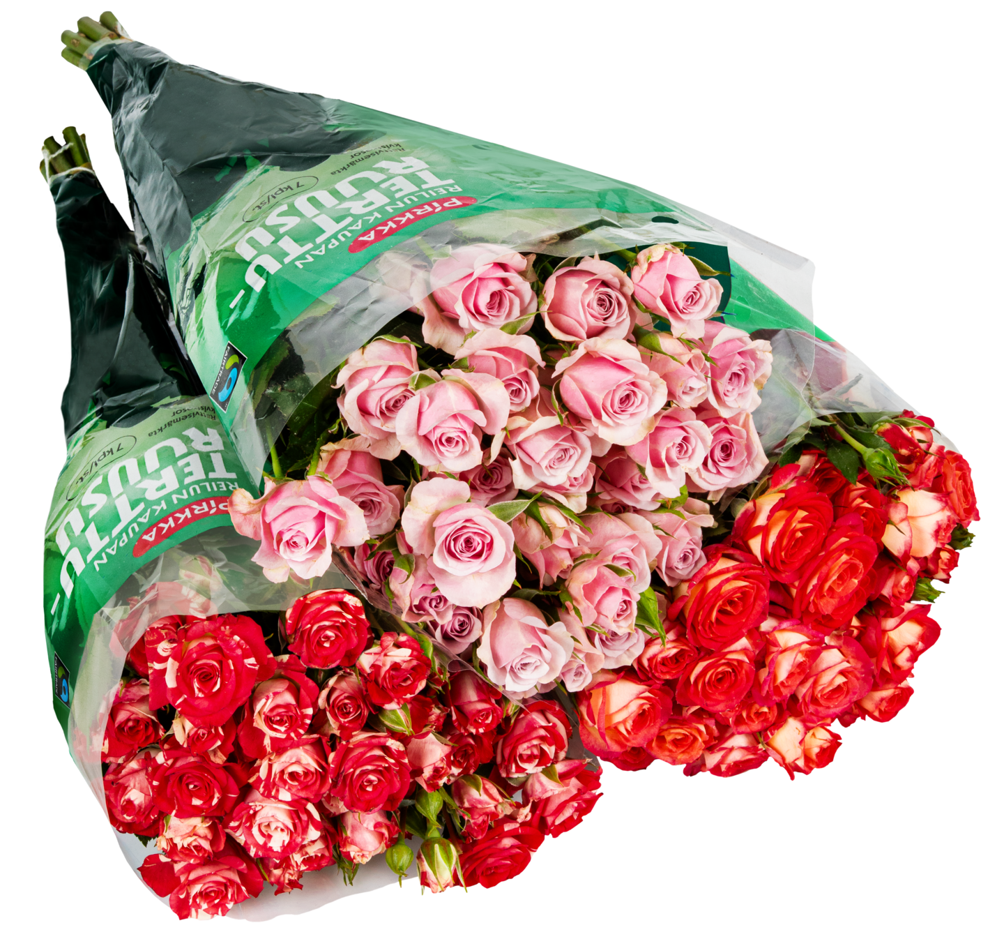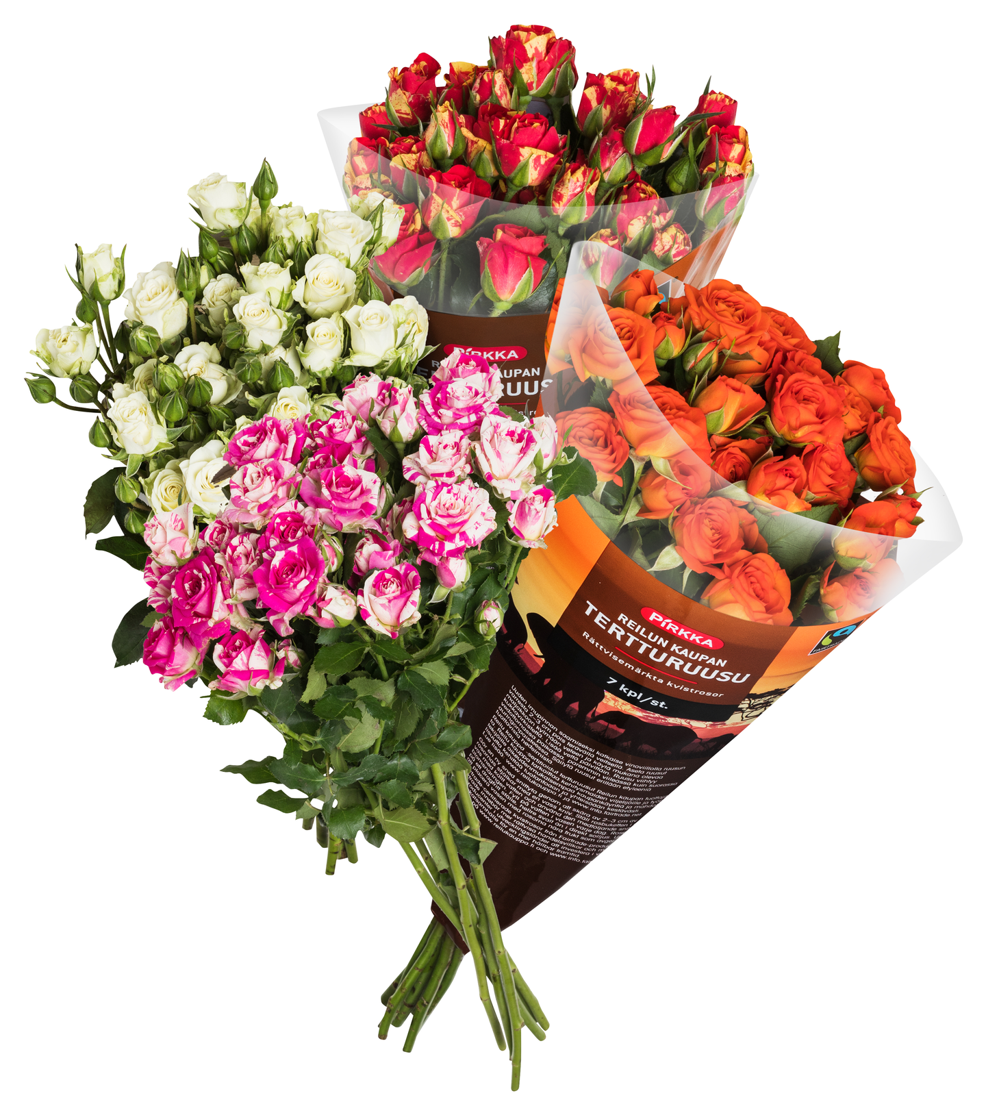 Uuden imupinnan saamiseksi katkaise vinoviillolla ruusun varresta 2-3 cm pois terävällä veitsellä. Aseta ruusut maljakkoon kylmään veteen ja käytä mukana olevaa kukkavirkistettä. Lisää vettä päivittäin. Ruusu viihtyy vedottomassa paikassa, paremmin viileässä kuin suorassa auringonpaisteessa. Säilytä ruusut erillään etyleeniä tuottavista hedelmistä.Reilu kauppa -sertifioidut tertturuusut Reilun kaupan tuottajilta. Reilu kauppa tarkoittaa kehitysmaiden viljelijöille ja työntekijöille oikeudenmukaisempaa kaupankäyntiä ja mahdollisuutta kehittää tuotantoaan ja yhteisöään kestävästi. Lue lisää: www.reilukauppa.fi ja www.info.fairtrade.net. Värivalikoima vaihtelee sesongin ja myymäläsaatavuuden mukaan.