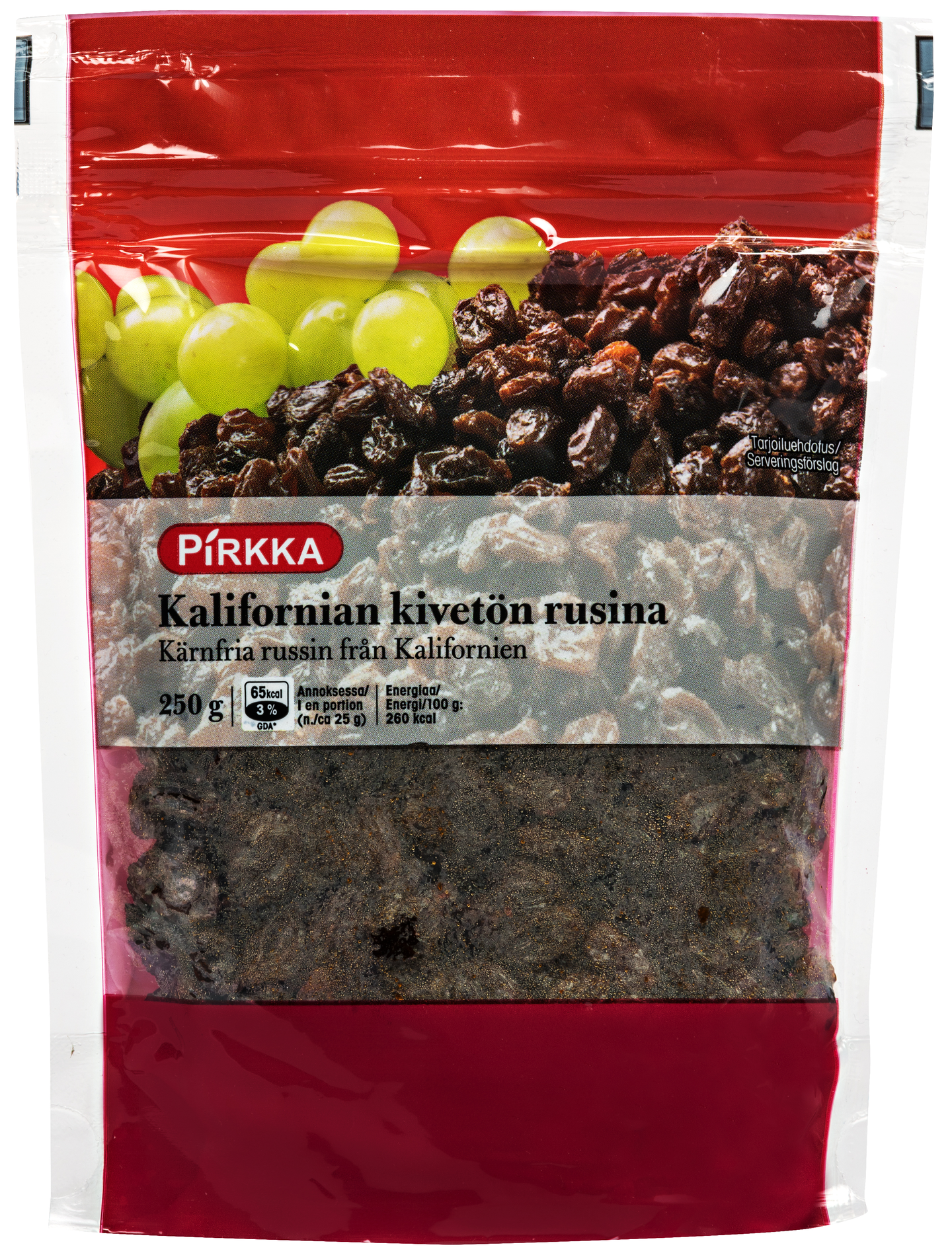 Pirkka rusinat sopivat välipalaksi ja naposteluun, leivontaan, salaatteihin, mysleihin, glögiin sekä simaan.