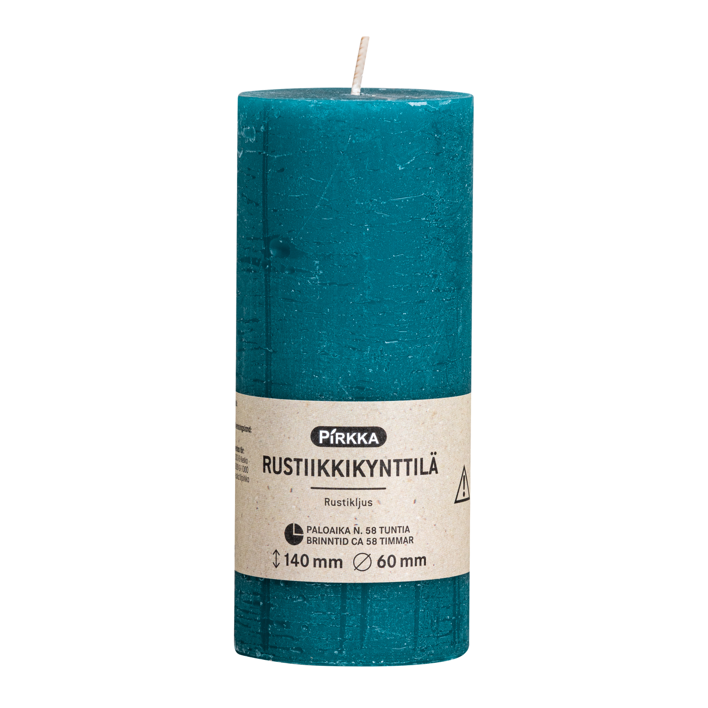 Pirkka rustiikkikynttilä on valmistettu 100% parafiinista ja palaa n.58 tuntia. Turkoosi kynttilä on kooltaan 60x140mm