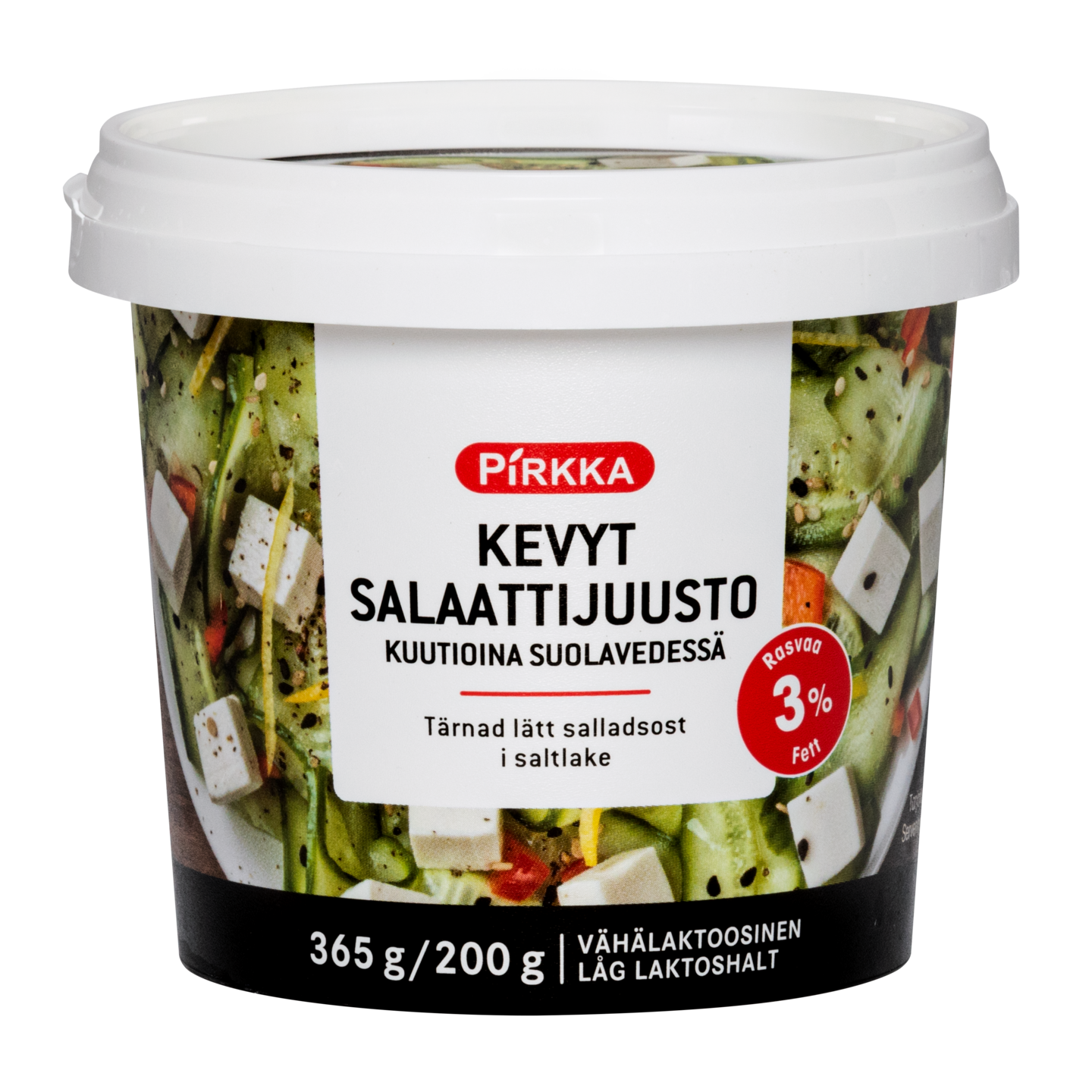 Pirkka kevyt salaattijuusto 3 % kuutiona suolavedessä tuo lisämakua salaatteihin ja kasvisruokiin. Erittäin vähärasvainen.