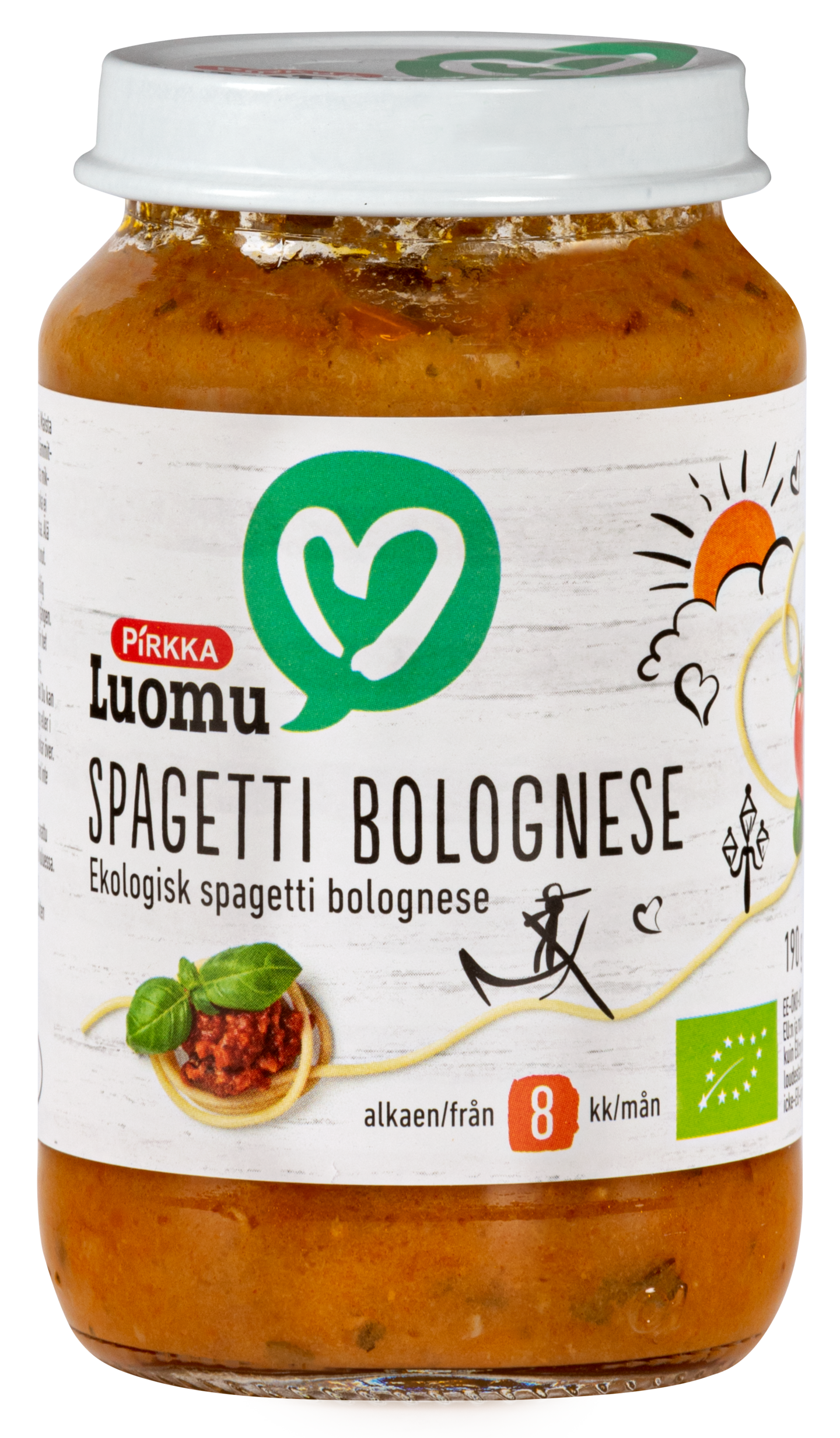 Pirkka Luomu spagetti bolognese on herkullinen ateria perheen pienimmille heti 8 kk ikäisestä alkaen ja se on valmistettu vain luomulaatuisista raaka-aineista. Maittava ja ruokaisa ateria sisältää kasviksia, naudanlihaa ja pastaa ja se on maustettu valkosipulilla ja yrteillä. Pirkka Luomu spagetti bolognese on pakattu lasipurkkiin, jossa se voidaan myös lämmittää mikrossa tai vesihauteessa. Käytön jälkeen kierrätä purkki lasinkeräykseen ja kansi metallinkeräykseen.