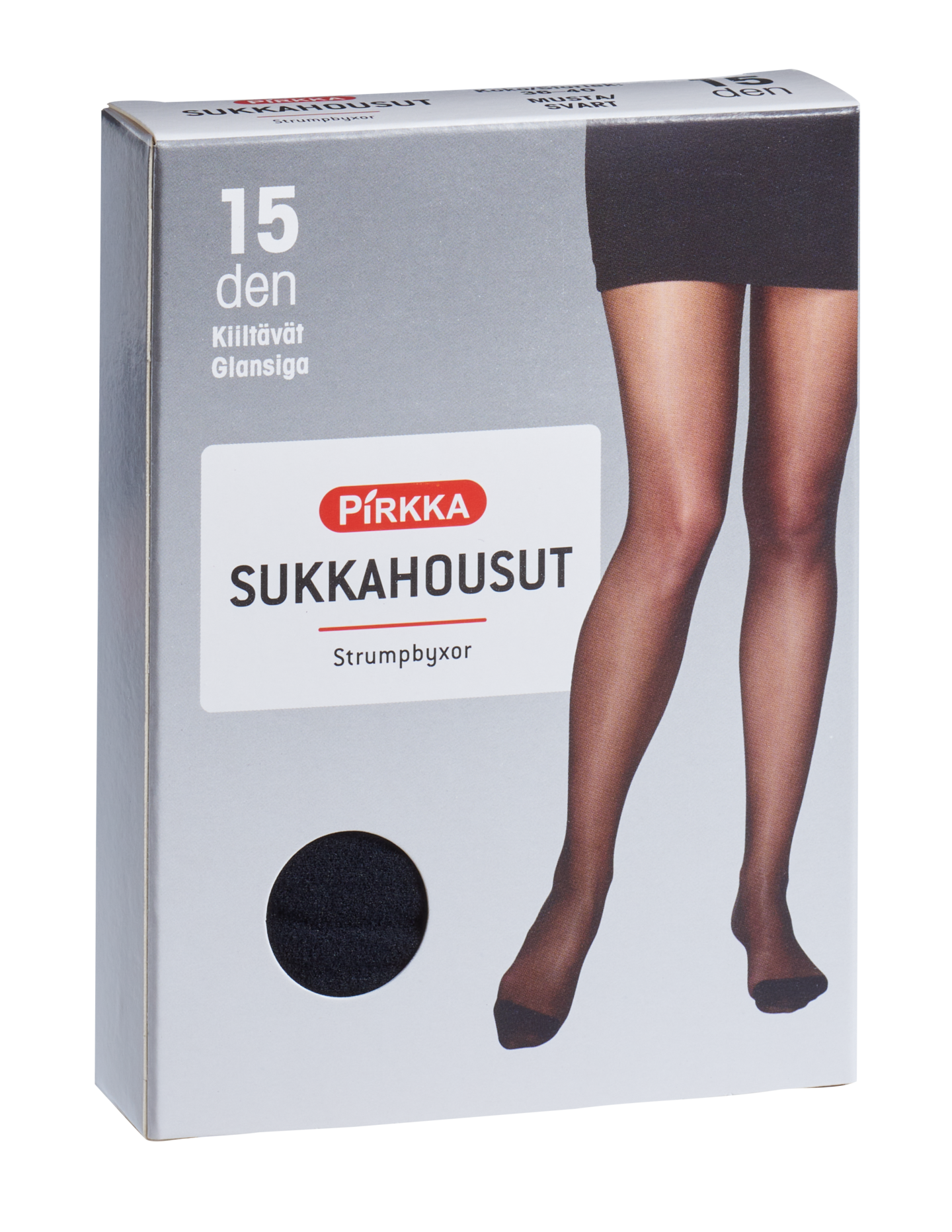 15 denierin kiiltävät sukkahousut, joissa haarakiila ja vahvistettu housuosa sekä jalassa kärkivahvike. Väri musta.