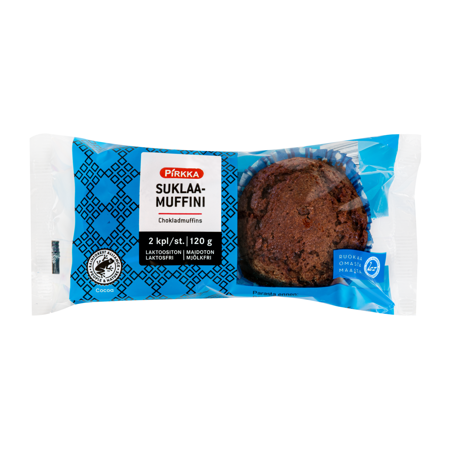 Tuplapakkaus herkullisia reilunkokoisia suklaamuffineja, joiden leivonnassa on käytetty suklaahippuja. Rainforest Alliance sertifioitua suklaata ja kaakaota.