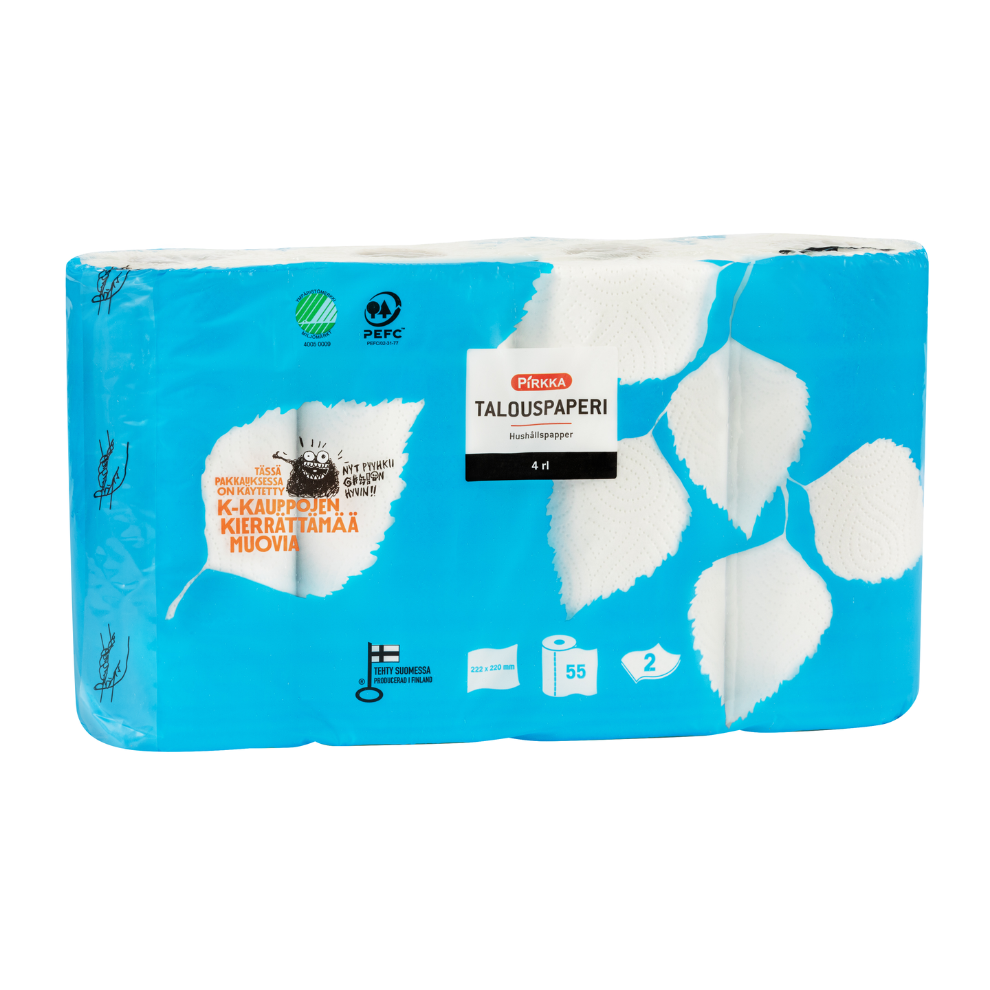 Pirkka valkoinen talouspaperi on kaksinkertaista pehmopaperia. Esimerkiksi keittiön pienten sotkujen pyyhkimiseen sopiva paperi on valmistettu ensiökuidusta ja kierrätyskuidusta. Yhdessä rullassa on noin 55 talouspaperiarkkia. Tuotteella on Avainlippu ja Joutsenmerkki.