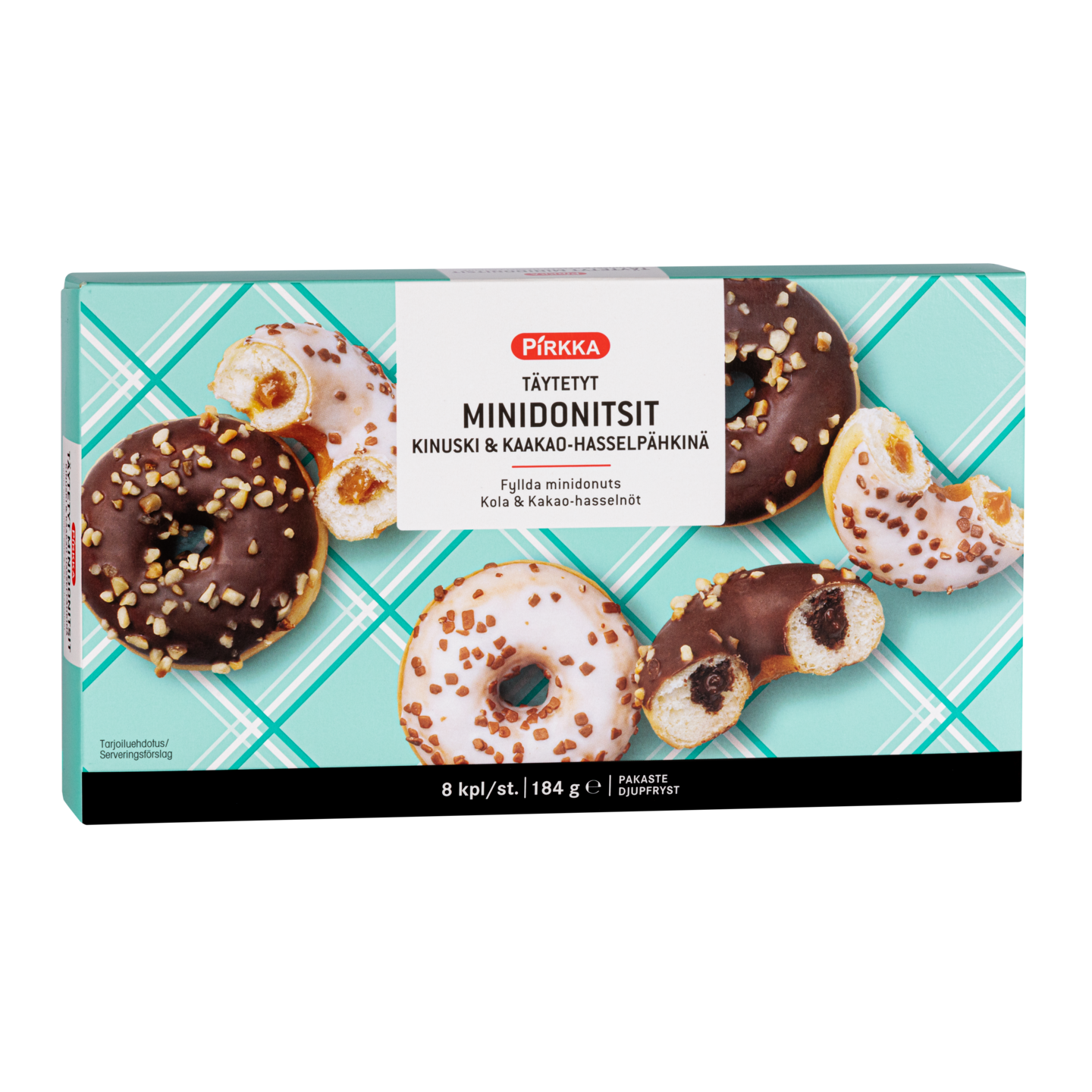 Pirkka täytetyt minidonitsit sisältävät kahta suussasulavaa donitsimakua. Kuorrutteen lisäksi donitseihin on leivottu makean maistuva täyte. Kinuskitäytteinen minidonitsi valkoisella kuorrutteella ja maitosuklaakoristelulla sekä kaakao-hasselpähkinätäytteinen minidonitsi kaakaokuorrutteella ja hasselpähkinäkoristelulla. Myydään pakasteena. Pakkaus sisältää kahdeksen minidonitsia, jotka sulavat huoneenlämmössä puolessa tunnissa. Helppo ja nopea tarjottava herkkusuille!
