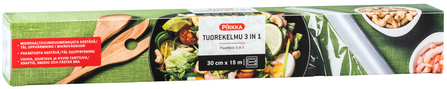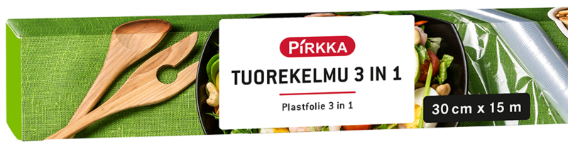 Pirkka 3 in 1 tuorekelmu on mikroaaltouunikuumennusta ja pakastusta kestävä, vahva, joustava ja tarttuva kelmu. Se sopii mm. lihan, juustojen, leikkeleiden, hedelmien, vihannesten ja rasvaisten ruokien säilytyskääreeksi sekä astioiden peittämiseen. Tuorekelmu ei ole täysin aromi- eikä rasvatiivis, joten sitä ei suositella kovin voimakastuoksuisten tai rasvaisten tuotteiden suojaksi (esim. sipuli ja voi).