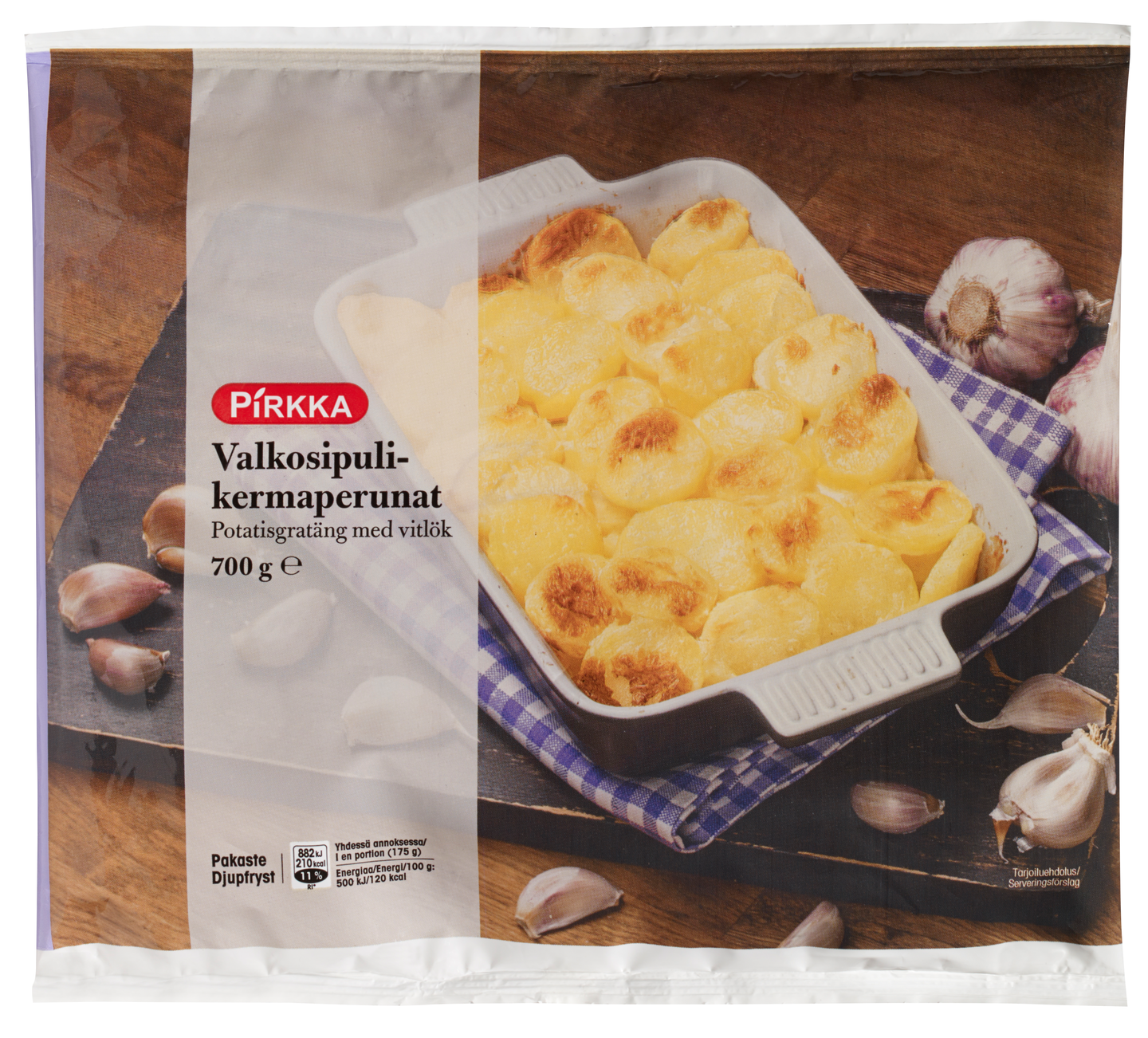 Pirkka valkosipulikermaperunat ovat herkullinen kokonaisuus viipaleperunoita, valkosipulia ja kermaa. Perunat sisältävät jo kerman ja suolan. Ne tarvitsee vain kypsentää!
