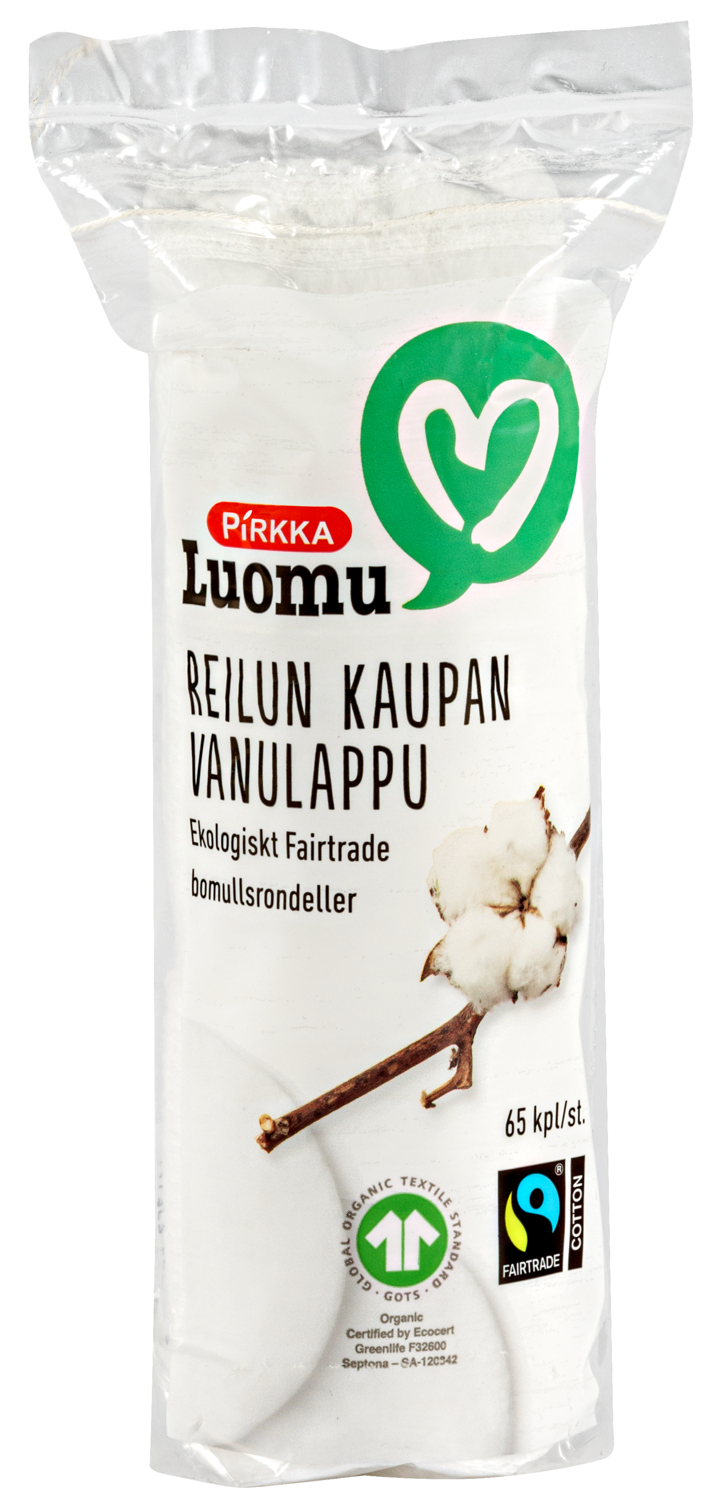 Pirkka Reilun Kaupan vanulaput on valmistettu Reilun Kaupan viljelijöiden tuottamasta puuvillasta. Vanulaput soveltuvat kauneudenhoitoon ja ihonpuhdistukseen.