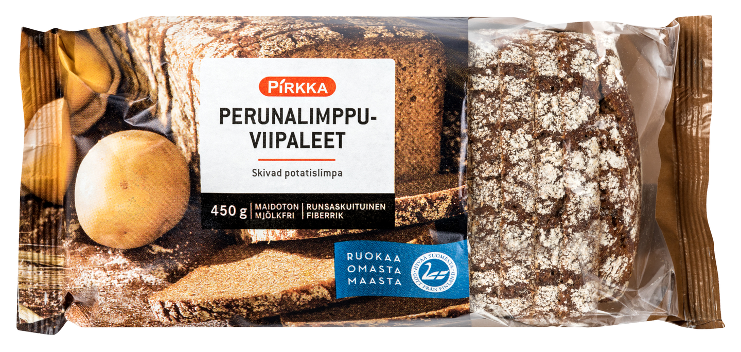 Pirkka viipaloitu perunalimppu on perinteinen, lisäaineeton, runsaasti suomalaista perunaa sisältävä vuokaleipä. Tuote on maidoton, runsaskuituinen (kuitua 9,9 g/100 g) ja se on valmiiksi viipaloitu noin 16 leipäviipaleeseen. Herkullinen, hieman makea perunalimppu on suomalaista leipää parhaimmillaan! Pirkka viipaloitu perunalimppu leivotaan Iltasmäessä ja sillä on Hyvää Suomesta -merkki.