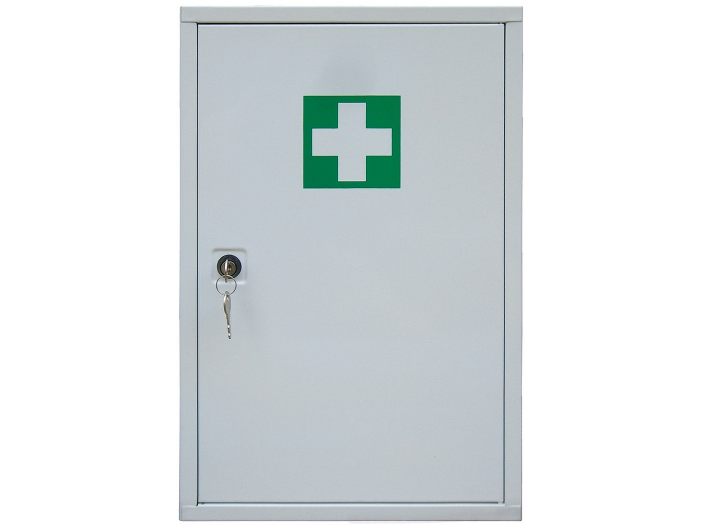 Lukittava teräksinen lääkekaappi. Kaapissa on kiinteät hyllyt.