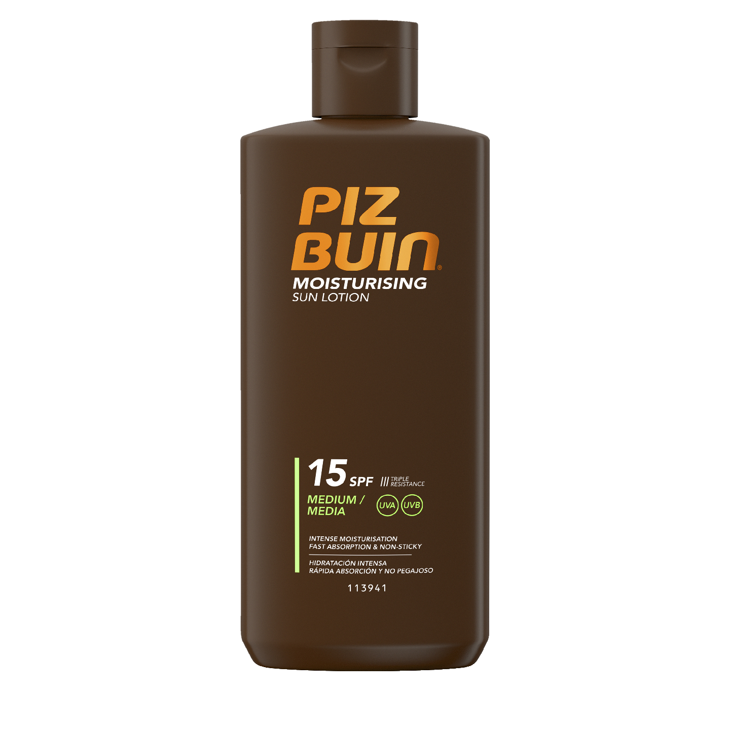 Piz Buin Moisturising Sun Lotion SPF15 suojaa ihoa haitallisilta UVA- ja UVB-säteiltä. Tehokkaasti kosteuttava aurinkosuojavoide, joka jättää ihon sileän tuntuiseksi. Imeytyy nopeasti, ei valkoisia jälkiä. Ei jätä rasvaista tuntua eikä tahmaa. Auttaa suojaamaan ihoa vahingoittavilta tekijöiltä, kuten kloorilta ja merivedeltä. Keskitason suojakerroin SPF 15. Hien ja vedenkestävä.