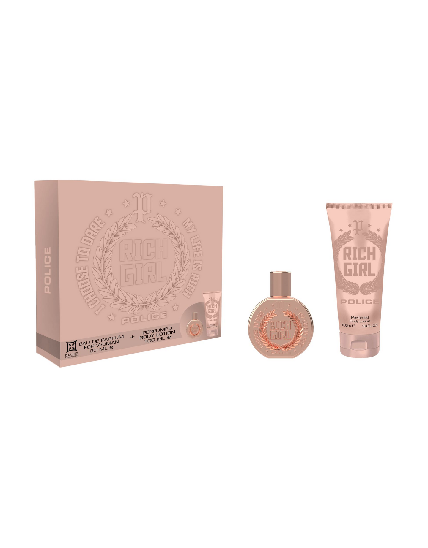 Police Rich Girl on tuoksu, joka vie sinut uuteen ulottuvuuteen. Rikas ja rohkea kokemus. Hedelmäisen kukkainen avaus, jossa yhdistyvät vadelmasorbetin makeus ja kukkakimppu. Se kehittyy sydämessä, jolle on ominaista valloittava kukkaistuoksu, joka yhdistyy harmonisesti hedelmäisiin elementteihin luoden eloisan ja persoonallisen tunteen. Tuoksu paljastaa kermaisen ja runsaan pohjan. Santelipuun ja vaniljan ympäröivät sävyt luovat lämpimän ja aistikkaan taustan, kun taas meripihka antaa syvyyttä”. Nämä hemmottelevat sävyt antavat luonnetta ja jättävät ainutlaatuisen ja arvokkaan jäljen.
