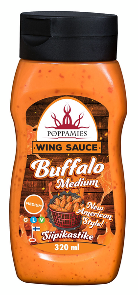 Poppamies Buffalo Medium -kastike tuo aitoa Buffalo-tyyliä siipiin, tarjoten klassisen makuelämyksen keskivahvalla potkulla. Mukavan etikkainen ja voinmakuinen kastike tekee jokaisesta suupalasta autenttisen Buffalo-elämyksen. Sen mullistava koostumus takaa, että kastike tarttuu siipiin täydellisesti ja pysyy pinnalla pitkään. Tämä kastike ei valu astian pohjalle, vaan jokainen siipi säilyttää täyteläisen, tasapainoisen maun. Buffalo Medium on täydellinen valinta niille, jotka haluavat tasapainoa maun ja tulisuuden välillä – ilman kompromisseja!