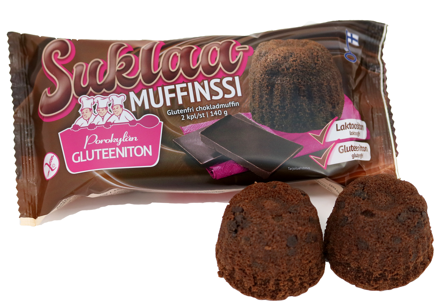 Täyteläinen voilla leivottu suklaamuffinssi kruunaa herkkuhetken. Saatavilla päivittäistavarakauppojen gluteenittomien kahvileipien hyllystä. Laktoositon, gluteeniton.