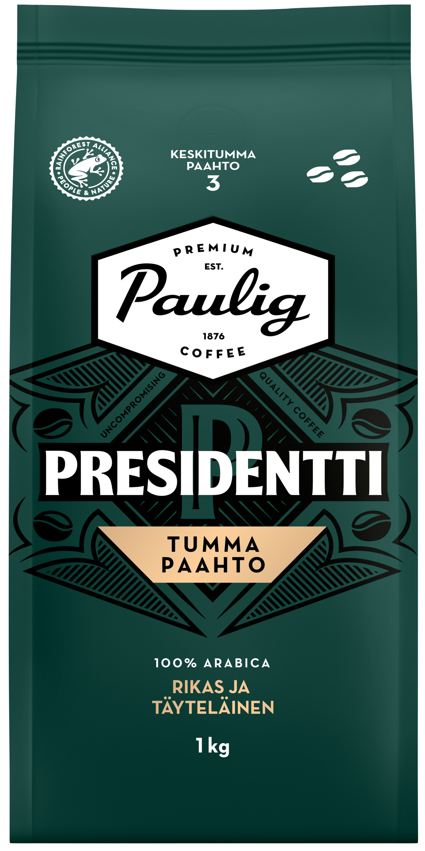PRESIDENTTI TUMMA PAAHTO Kädessäsi ei ole tavallinen kahvi, vaan Presidentti Tumma Paahto. Makukärki tulee Etelä-Amerikan ja Kenian korkealaatuisista 100 % arabica-kahvipavuista, jotka tuovat kahviin mustaherukkaisen vivahteen. Täyteläinen kahvi, jonka jälkimaussa korostuvat pähkinäsuklaan vivahteet. Paahtoaste 3. Rainforest Alliance -sertifioitu. Lisätietoa: ra.org. Presidentti. Hyvällä maulla vuodesta 1929.