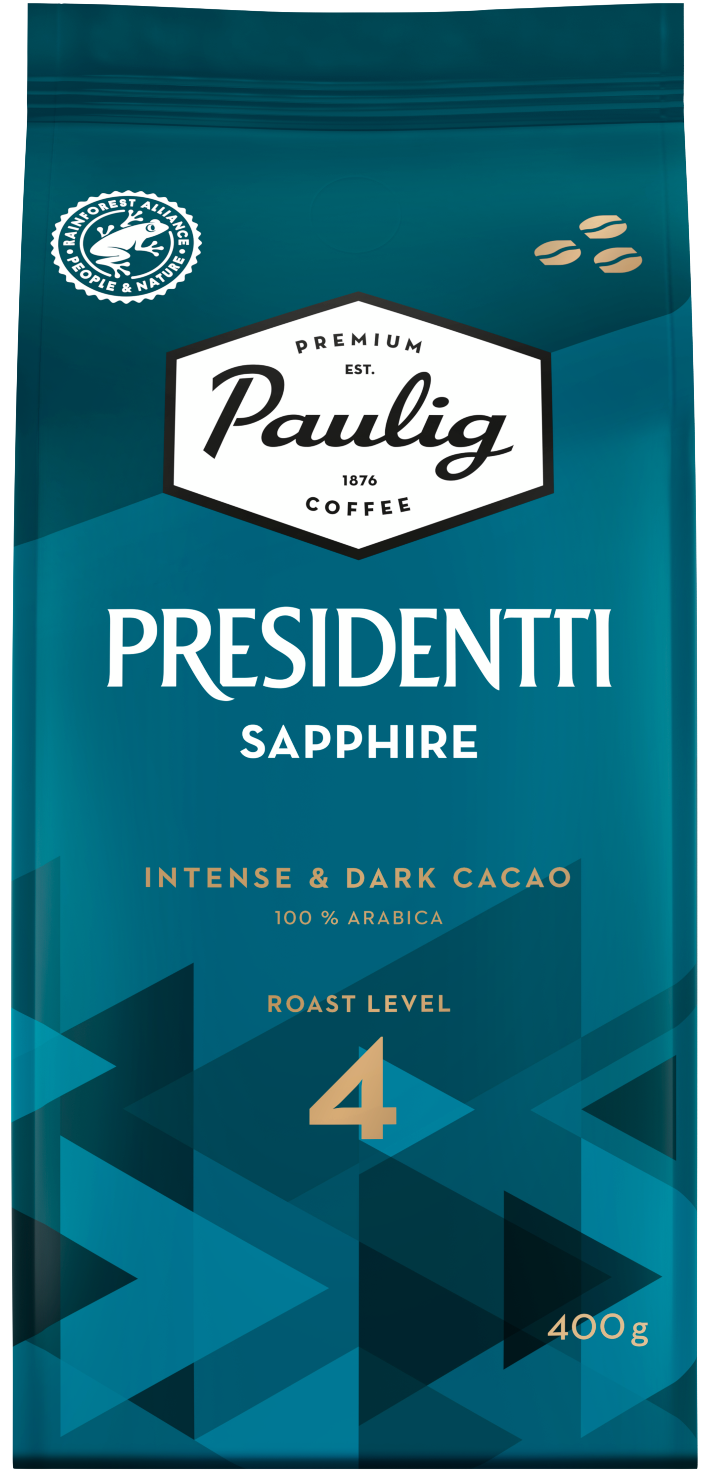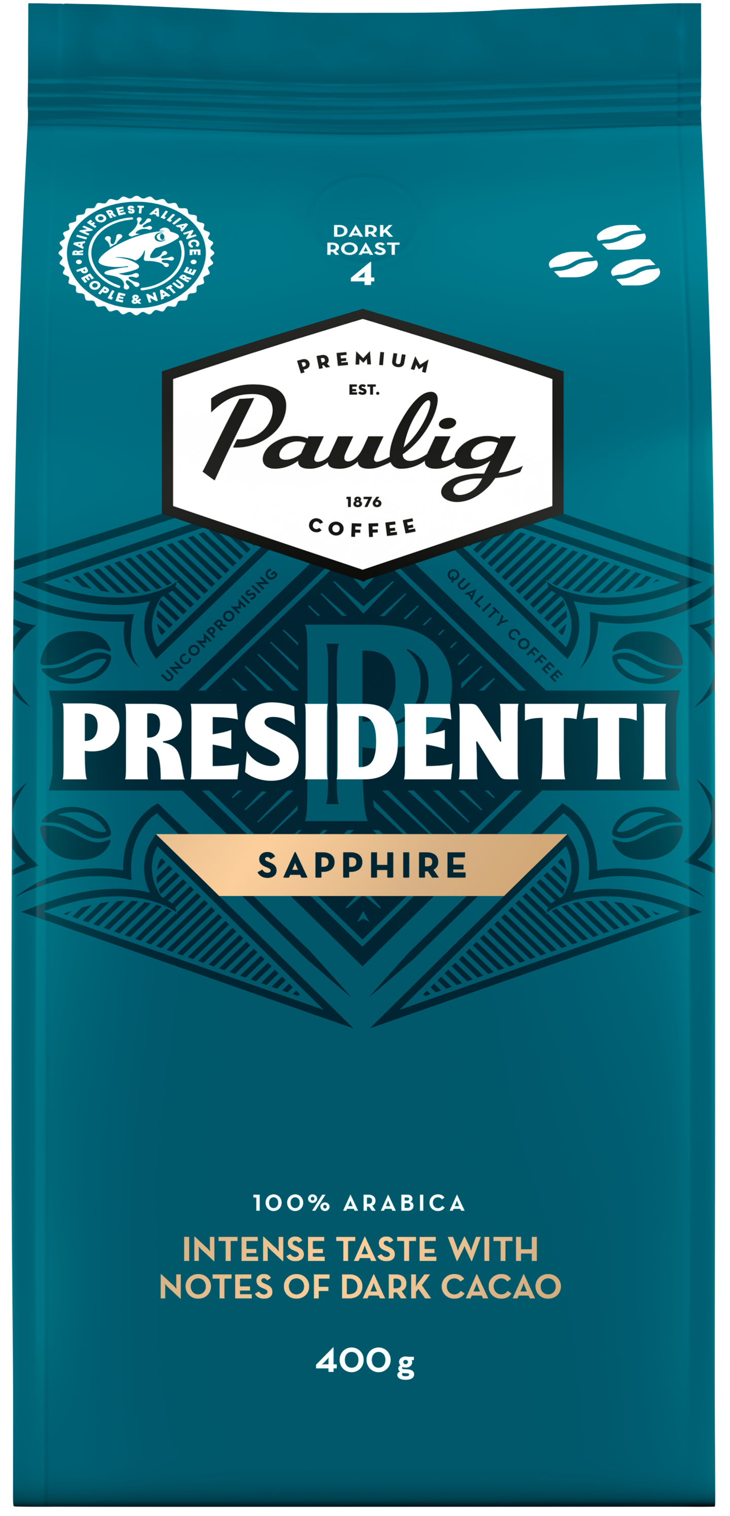PRESIDENTTI SAPPHIRE Kädessäsi ei ole tavallinen kahvi, vaan Presidentti Sapphire. Ainutlaatuiset piirteensä kahvi saa korkealaatuisista itäafrikkalaisista 100 % arabica-kahvipavuista. Intensiivinen tummapaahtoinen kahvi hurmaa tumman kaakaoisella maulla. Viipyilevässä jälkimaussa korostuvat tummien marjojen vivahteet. Presidentti. Hyvällä maulla vuodesta 1929. Paahtoaste: 4 Rainforest Alliance -sertifioitu. Lisätietoa: ra.org.