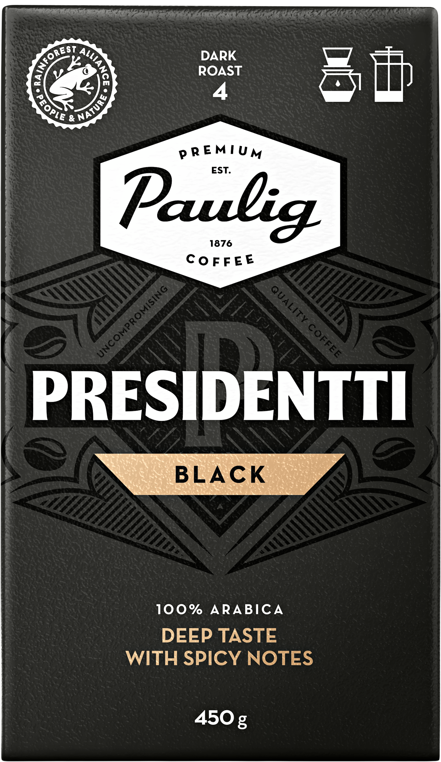 PRESIDENTTI BLACK Kädessäsi ei ole tavallinen kahvi, vaan Presidentti Black. Makukärki tulee Itä-Afrikan, kuten Kenian korkealaatuisista, 100 % arabica-kahvipavuista. Täyteläinen tummapaahtoinen kahvi, joka on mausteisen vivahteikas. Pitkässä jälkimaussa on tumman suklaisia vivahteita. Presidentti. Hyvällä maulla vuodesta 1929.