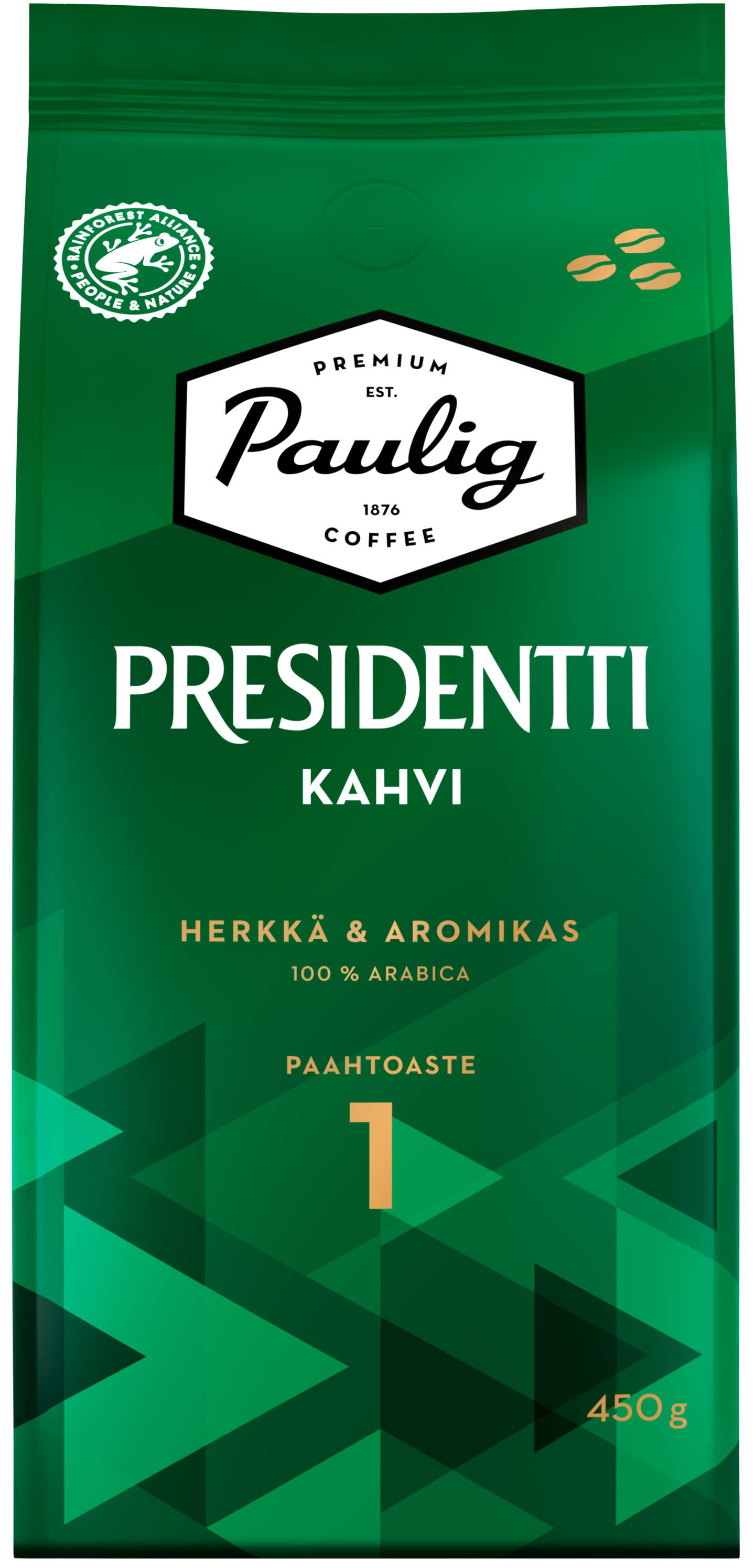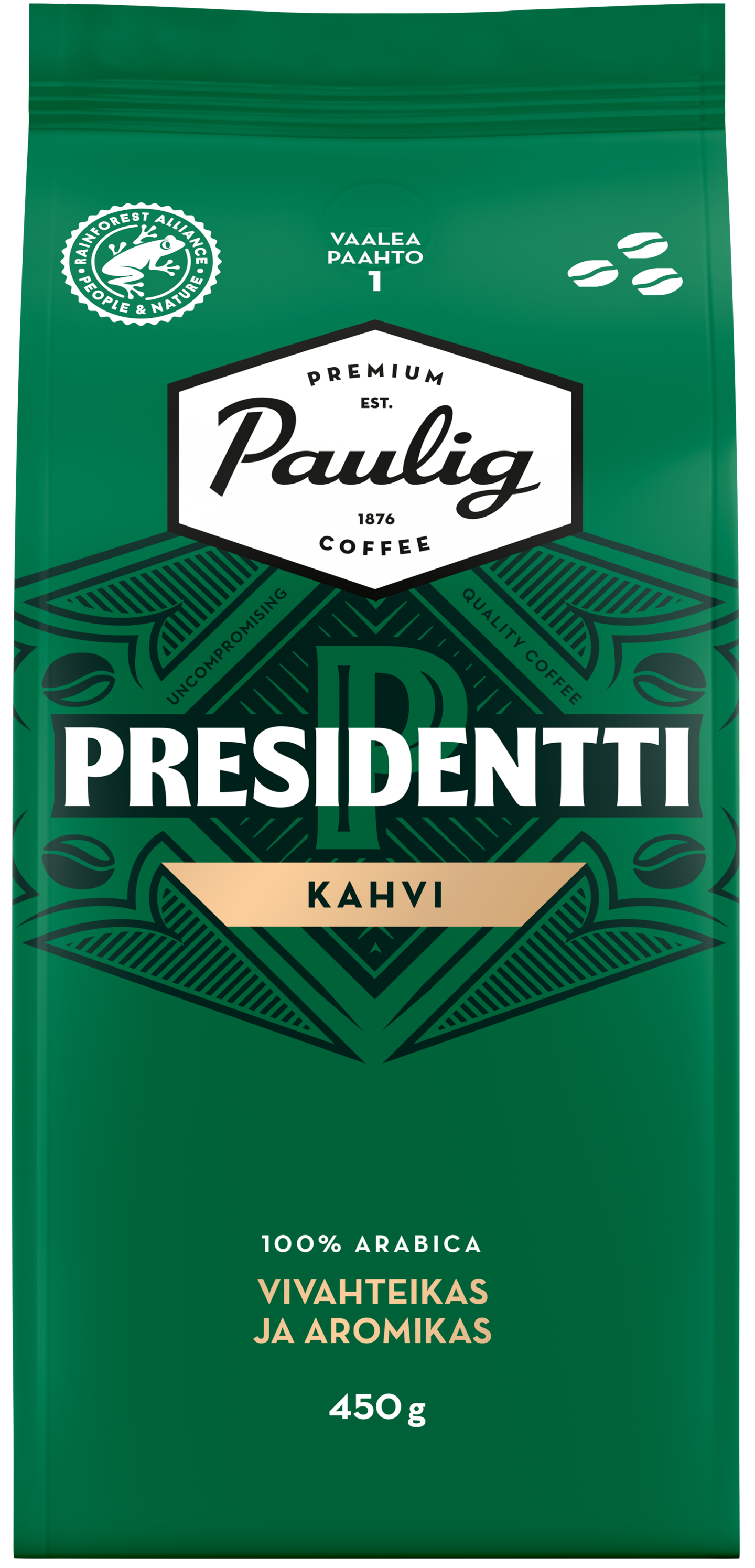 PRESIDENTTI KAHVI Kädessäsi ei ole tavallinen kahvi, vaan Presidentti. Makukärki tulee Väli-Amerikan, Kenian ja Etiopian korkealaatuisista 100 % arabica-kahvipavuista. Kahvi on rikkaan aromikas ja jälkimaussa korostuvat makean marjaiset vivahteet. Presidentti. Hyvällä maulla vuodesta 1929. Paahtoaste 1. Rainforest Alliance -sertifioitu. Lisätietoa: ra.org.