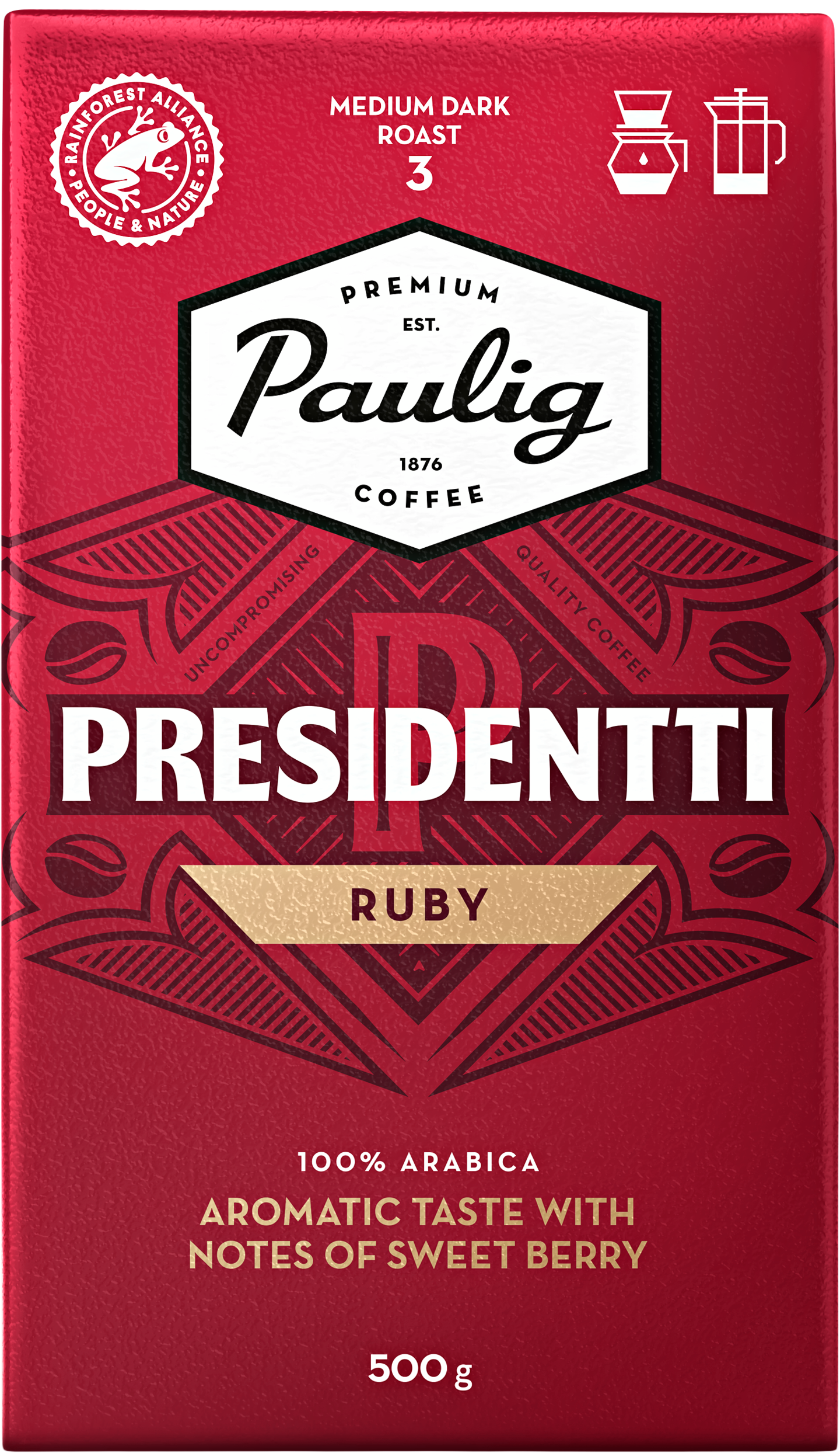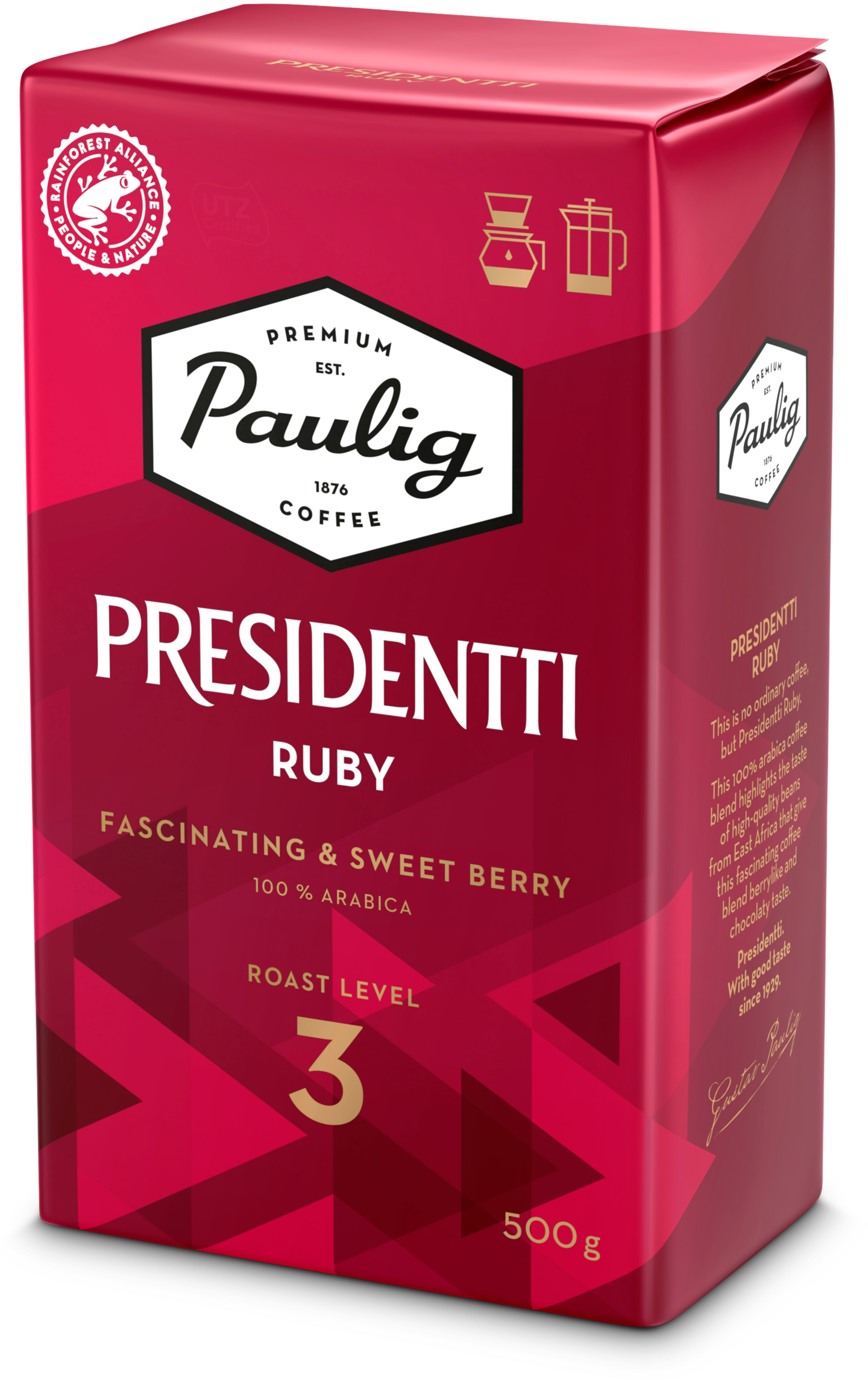 PRESIDENTTI RUBY Kädessäsi ei ole tavallinen kahvi, vaan Presidentti Ruby. Makukärki tulee Itä-Afrikan korkealaatuisista 100 % arabica-kahvipavuista, jotka antavat tälle aromikkaalle kahvisekoitukselle marjaisan maun. Jälkimaussa korostuvat pehmeän suklaiset vivahteet. Presidentti. Hyvällä maulla vuodesta 1929.