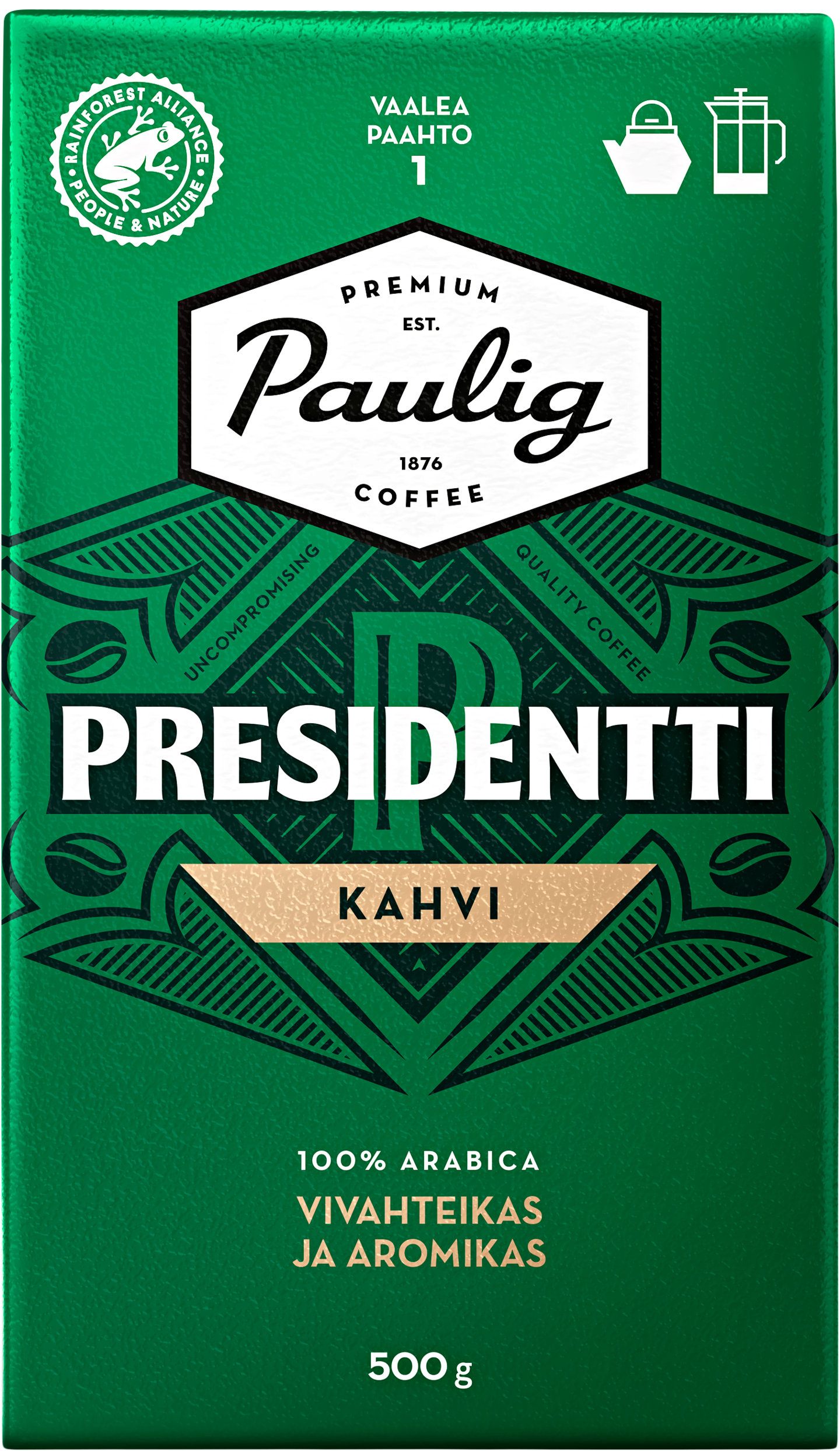 Presidentti-kahvi on todellinen klassikko, jonka maussa korostuvat Väli-Amerikan, Kenian ja Etiopian korkealaatuiset arabica-kahvipavut. Maku on rikkaan aromikas, marjainen ja charmantti. Vaaleapaahtoinen Paulig Presidentti -kahvi on nautinnollinen valinta jokaiseen kahvihetkeen. Kahvipöydässä Presidentti on parhaimmillaan kermaisten leivonnaisten kanssa. Paahtoaste 1. Rainforest Alliance -sertifioitu. Lisätietoa: ra.org. • Vaaleapaahtoinen kahviklassikko korkealaatuisista arabica-kahvipavuista (pannujauhatus) • Herkkä ja aromikas, marjainen ja charmantti maku