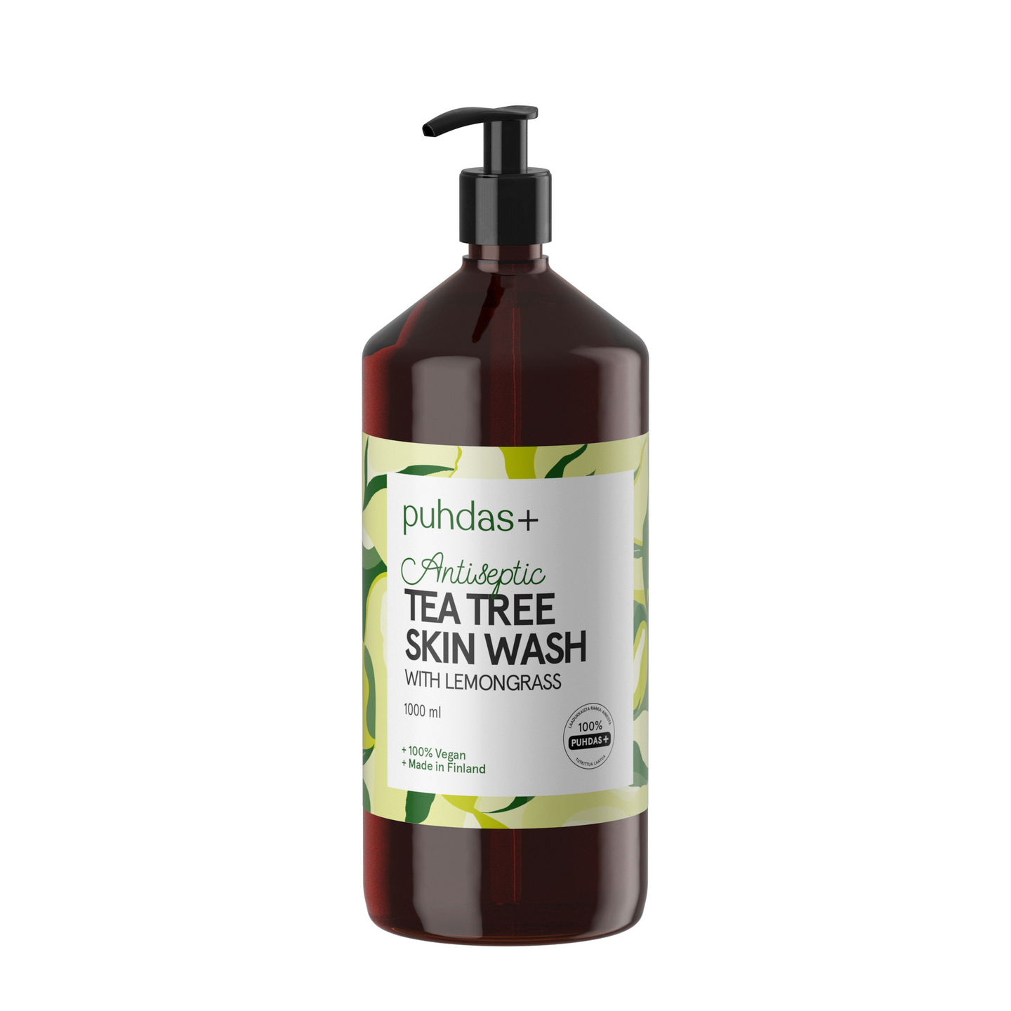 Puhdas+ Tea Tree Skin Wash on täydellinen pesuneste käsille, kasvoille ja vartalolle. Se sisältää antiseptistä teepuuöljyä, joka puhdistaa ja hoitaa ihoa, mutta ei kuivata sitä. Teepuu on pieni pensaskasvi, joka kasvaa trooppisessa ilmastossa. Teepuun voimakas suosio perustuu sen tehokkaisiin puhdistaviin ominaisuuksiin. Pesunesteen sisältämä sitruunaruoho puhdistaa ja virkistää ihoa. Pesuneste soveltuu koko perheelle ja se on pakattu kätevään ja hygieeniseen pumppupulloon.