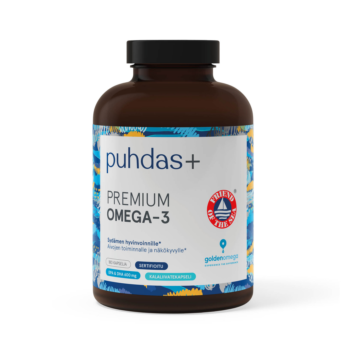 Sydämen ja aivojen hyvinvoinnille! Puhdas+ Premium Omega-3 on puhdas ja sertifioitu kalaöljykapseli. Tuote takaa vahvan annoksen EPA - ja DHA-rasvahappoja mahdollisimman puhtaassa triglyseridi-muodossa. DHA ja EPA edistävät sydämen toimintaa. DHA on tärkeä aivojen toiminnalle ja näkökyvylle. Puhdas+ Premium Omega-3 -valmisteiden tuotannossa käytetään ei-uhanalaista, villiä sardellia, joka on ka lastettu Etelä-Tyynimeren saastumattomilta vesiltä. Kalaöljy käy läpi hyvin perusteellisen puhdistusprosessin ennen kuin se päätyy k apseliin. Tämän takia kalaöljy ei sisällä raskasmetalleja tai muita myrkkyjä. Kalaöljymme Totox-luku on yleensä alle 5, eli se hapet tuu hyvin vähän. Jokainen kalaöljyerä on 100% jäljitettävissä. Puhdas+ Omega-3 -tuotteilla on Friend of the Sea sertifikaatti. Osta malla Friend of the Sea -sertifioituja tuotteita autat ylläpitämään luonnon kalakantoja. Sertifiointi varmistaa ympäristöystävällise n kalastuksen, uhanalaisten kalojen säilyttämisen sekä 100 % jäljitettävyyde n.