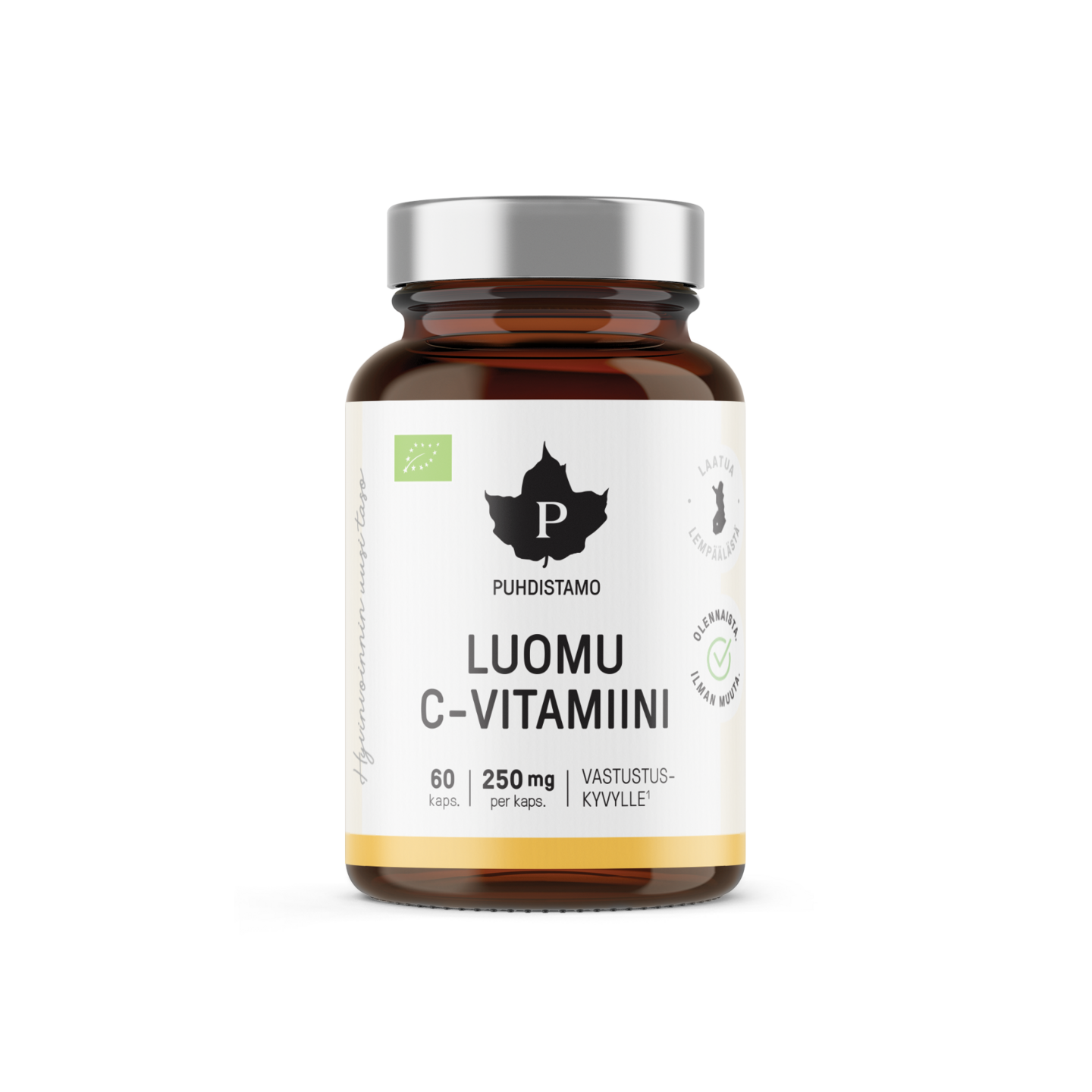 Puhdistamon Luomu C-vitamiini sisältää amla-marjasta uutettua luonnollista C-vitamiinia kapselimuodossa. C-vitamiini edistää immuunijärjestelmän normaalia toimintaa ja auttaa ylläpitämään sitä myös raskaan liikunnan jälkeen. Lisäksi se tukee normaalia kollageenin muodostumista, joka on tärkeää ihon, luuston, verisuonten ja rustojen hyvinvoinnille. C-vitamiini edistää myös hermoston normaalia toimintaa sekä energia-aineenvaihduntaa. Vegaaninen tuote.