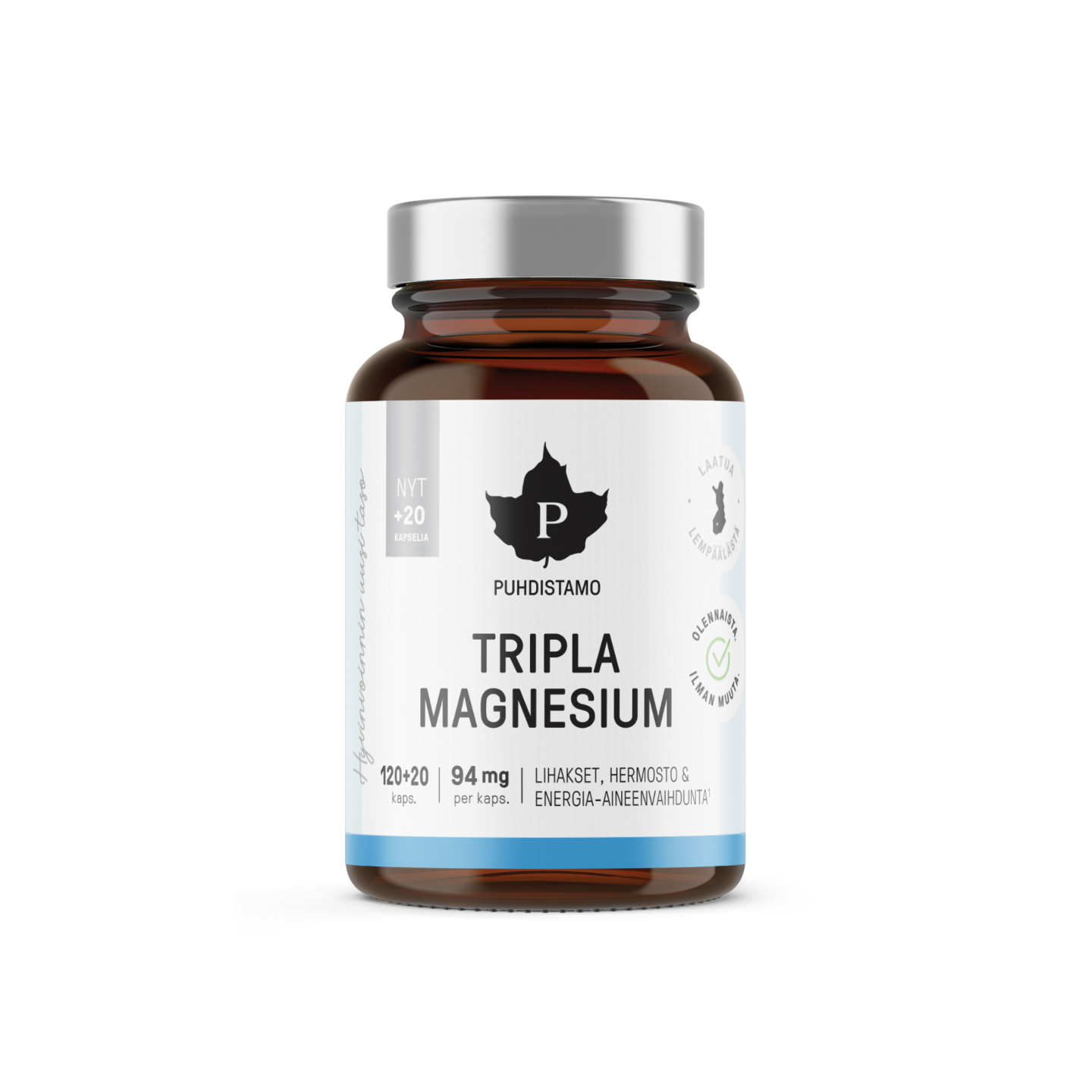 Puhdistamon Tripla Magnesium sisältää kolmea korkealaatuista magnesiumin muotoa: magnesiummalaattia -glysinaattia ja -tauraattia tasapainoisena yhdistelmänä. Magnesium edistää normaalia lihasten ja hermoston toimintaa, proteiinisynteesiä ja energia-aineenvaihduntaa sekä tukee luuston pysymistä normaalina. Tripla Magnesium on hellävarainen eikä sisällä lainkaan täyteaineita.