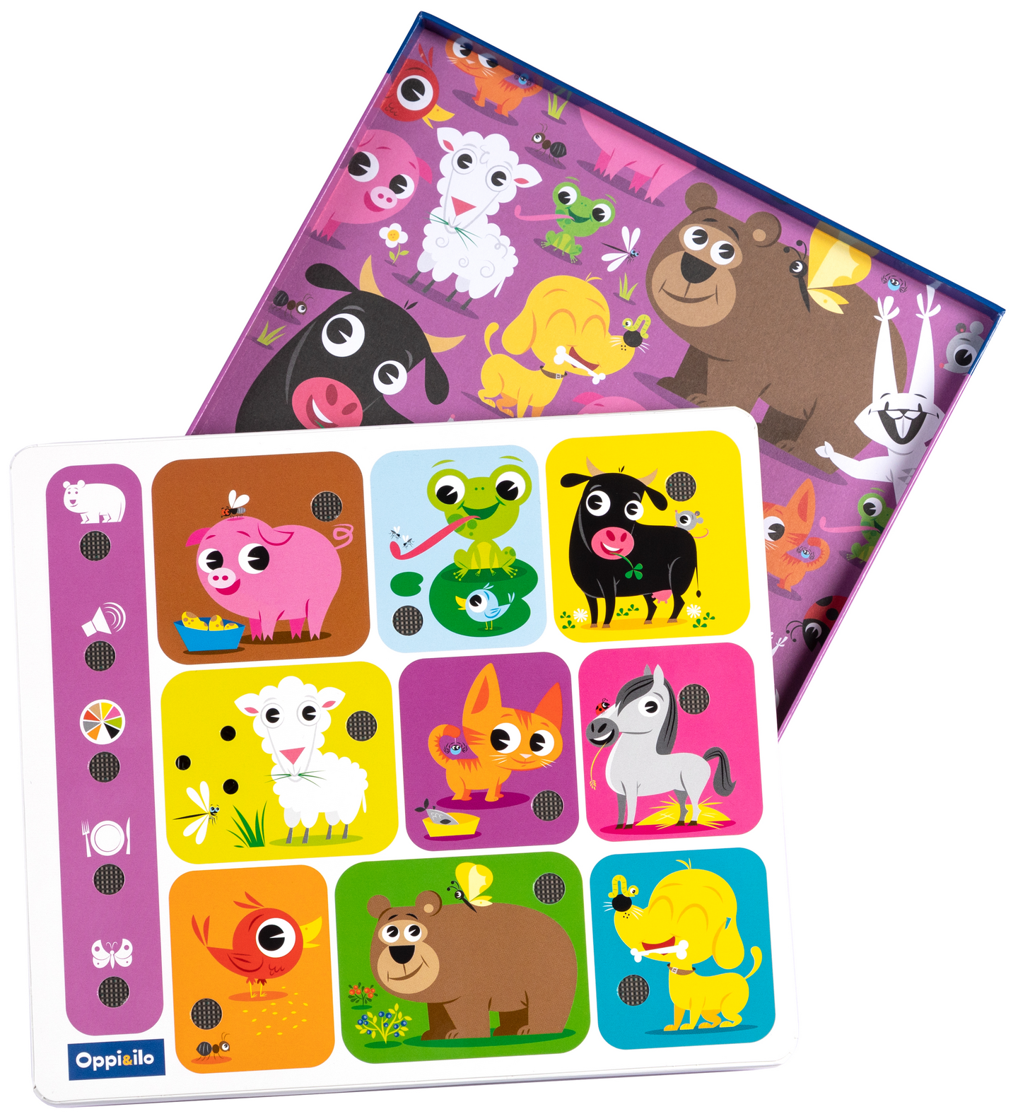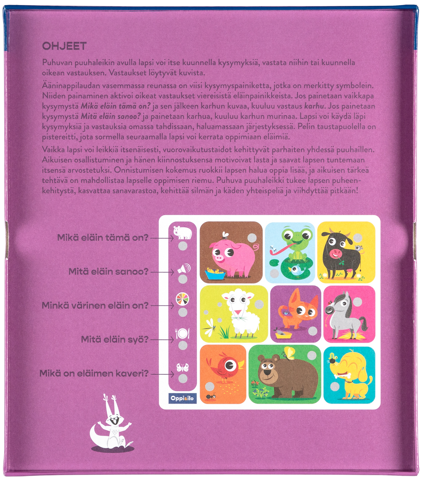 Minkä värinen karhu on? Ruskea! Entä mitä karhu syö? Marjoja! Mitä karhu sanoo? MURR! Puhuvassa puuhaleikissä riittää eläinaiheista katsottavaa ja kuunneltavaa! Innostavan ja uudenlaisen leikkituotteen parissa lapsi voi kuunnella kysymyksiä ja vastata niihin itse tai kuunnella oikean vastauksen ääninappia painamalla. Puhuva puuhaleikki sisältää 45 veikeää sanaa ja ääntä. Iloisen värikkäät eläimet hurmaavat pienen leikkijän! Monipuolinen puuhaleikki tukee puheenkehitystä, kehittää silmän ja käden yhteispeliä ja innostaa kysymään lisää. Hauska puuhaleikki innostaa yhä uudelleen!