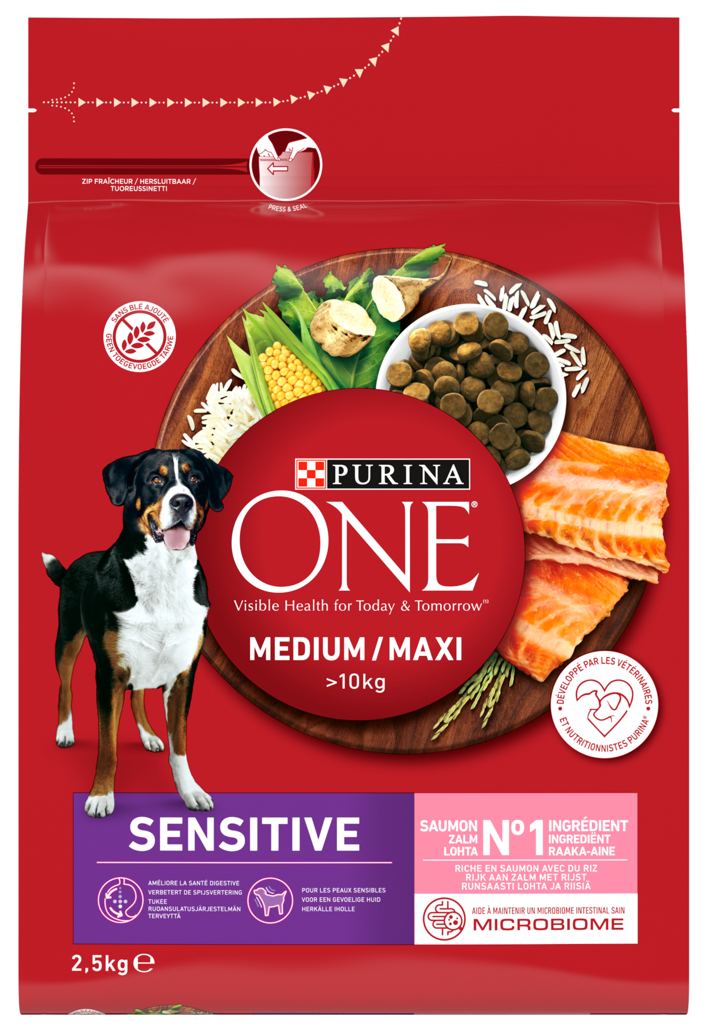 Purinan asiantuntijoiden kehittämä edistyksellinen Purina ONE Medium/Maxi > 10 kg Sensitive -ravinto on kehitetty erityisesti koirille, joilla on herkkä iho ja ruoansulatus. Ensimmäisenä ainesosana on lohi, joka sisältää runsaasti omega-3-rasvahappoja, jotka auttavat koiran herkän ihon hoidossa. Ravinto ei sisällä lisättyä vehnää.