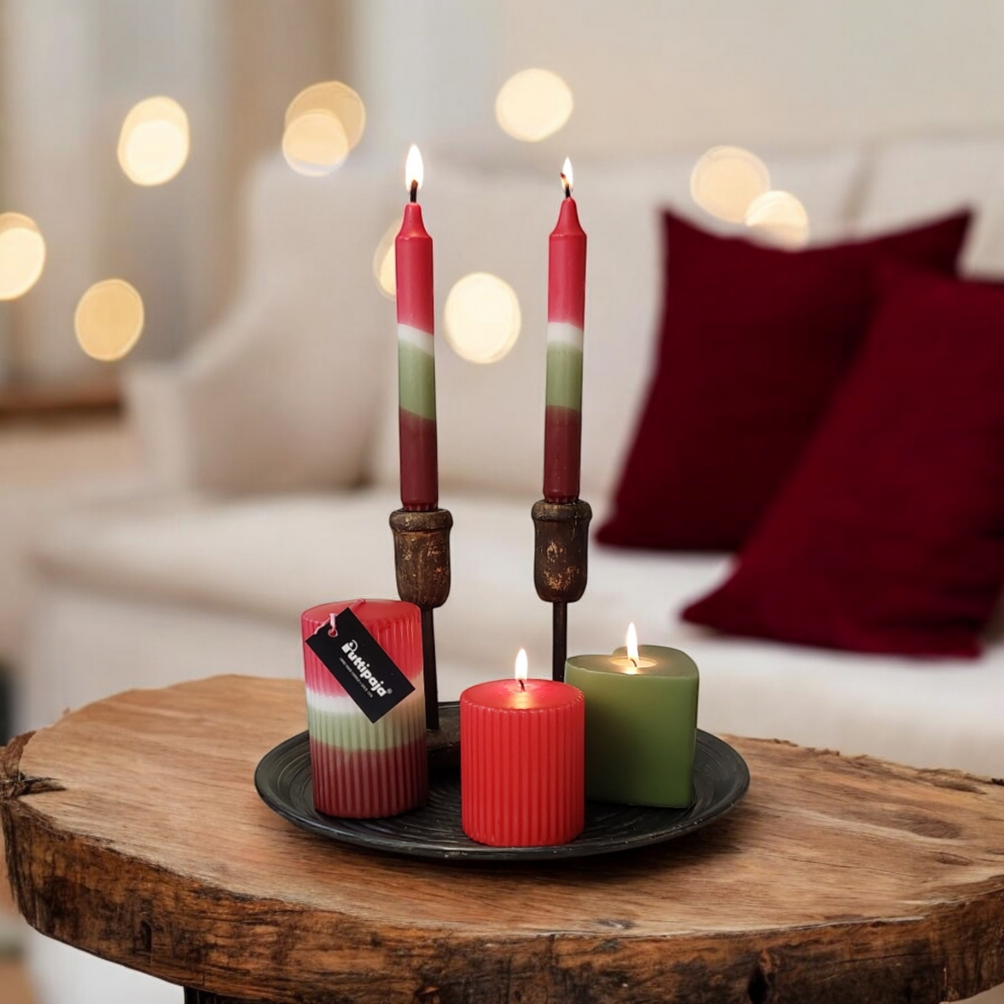 Raidalliset vekkikynttilämme valmistetaan käsityönä Dip dye -menetelmällä, joten jokainen kynttilä on upeasti uniikki.