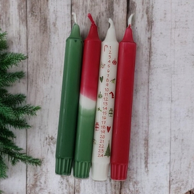 Uniikit Dip Dye -menetelmällä valmistetut viininpunaiset ja vihreät kruunukynttilät tuovat joulun tunnelmaa.