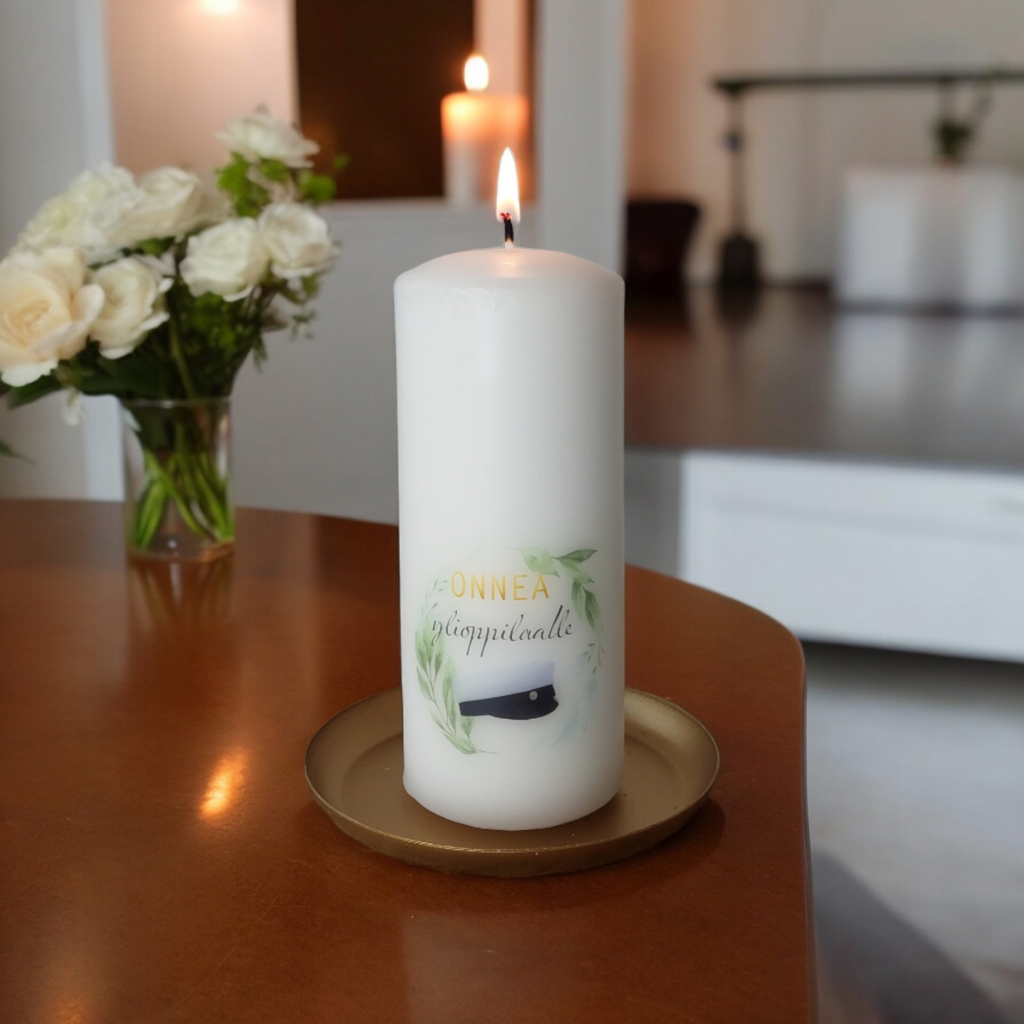 Onnittele ylioppilasta tällä ihastuttavalla onnittelukynttilällä! Siirtokuvatekniikalla koristetussa kynttilässä on ylioppilaslakki herkän, vihreän kranssin keskellä, sekä teksti "Onnea ylioppilaalle!".