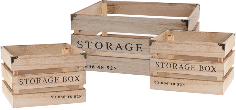 Kauniin puunvärisen laatikon yläkulmissa on metalliset vahvikkeet ja siinä lukee kyljessä "Storage box". Laatikoita on kahta eri kokoa. Suuremman, L-kokoisen laatikon mitat ovat 36 x 27 x 17,5 cm.