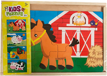 Iloiset kuvat ja kirkkaat värit ilahduttavat palapelin rakentajaa ja samalla kehittyvät lapsen hahmotuskyky ja sorminäppäryys. Kätevä 4in1 –laatikko sisältää neljä palapeliä, joissa on 12 palaa.