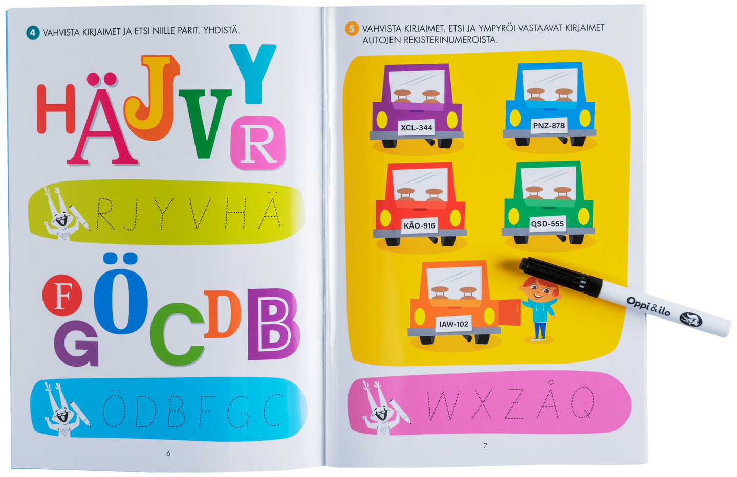 Millä äänteellä sana apina alkaa? Entä mihin äänteeseen sana avain päättyy? Osaatko ratkoa kirjainsokkelon? Monipuolisissa tehtävissä tunnistetaan kirjaimia, kuulostellaan äänteitä ja kirjoitetaan ensimmäisiä sanoja. Iloiset tehtävät kehittävät lapsen luku- ja kirjoitustaitoa kuin huomaamatta. Poispyyhittävällä tussilla tehtävät voi tehdä yhä uudelleen ja uudelleen!