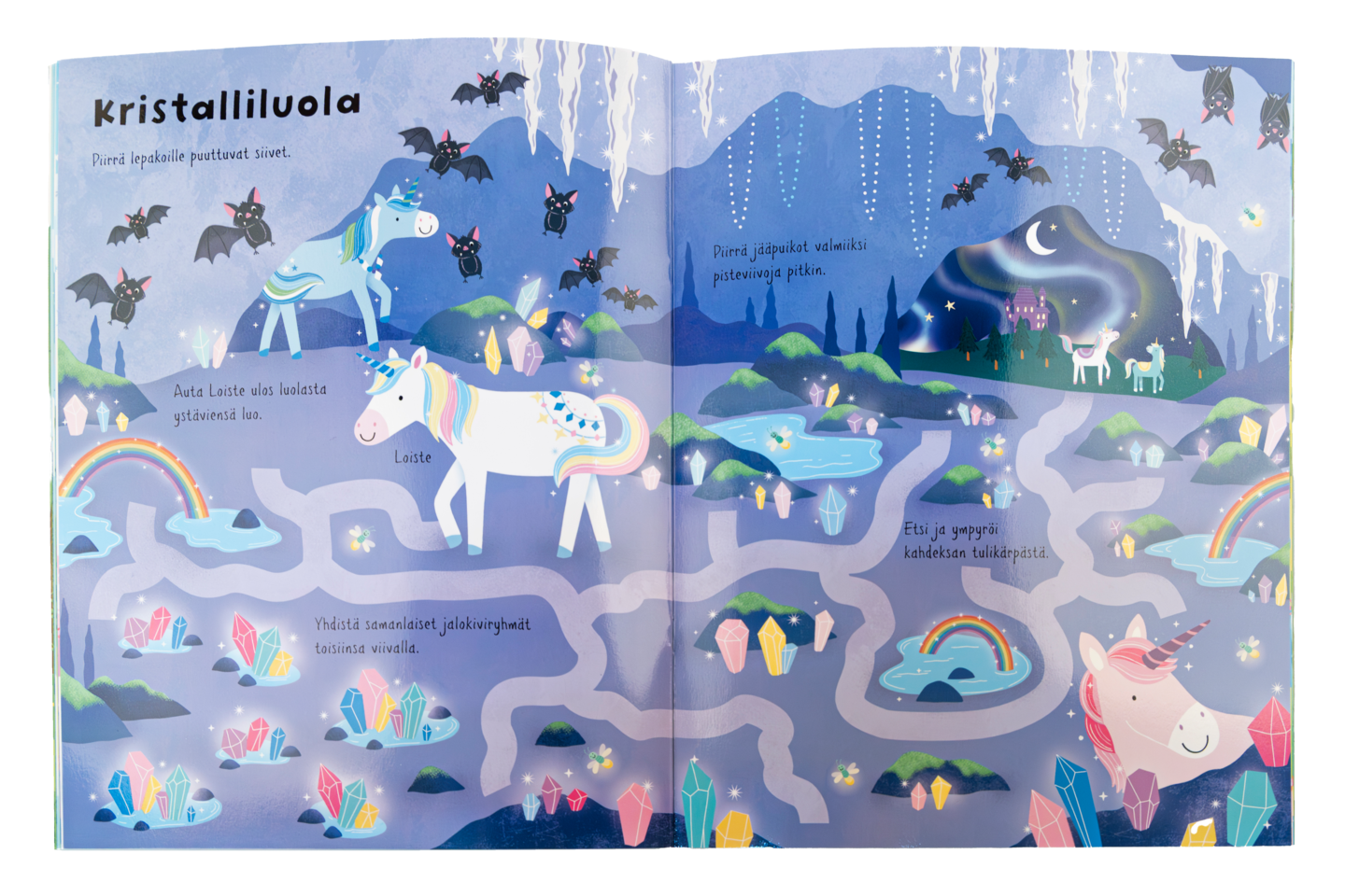 Puuhakirjassa seikkaillaan yksisarvisten lumotussa maailmassa. Hauskoissa tehtävissä etsitään eroja, ratkotaan sokkeloita, täydennetään kuvia ja yhdistetään numeroita. Puuhailun lomassa opitaan käden ja silmän yhteistyötä, keskittymistä sekä lukuja ja logiikkaa. Piirrä, pyyhi ja piirrä taas!