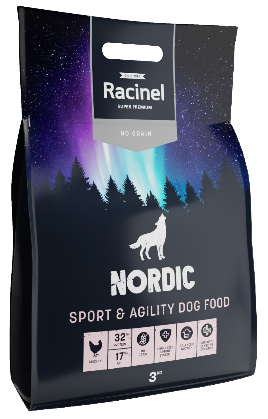 Racinel Nordic sport & agility - Energiaa urheileville koirille - Viljaton helposti sulava täysravinto sisältää maatilalla kasvatettua kanaa ja muita huippulaadukkaita ainesosia, jotka auttavat koiria saamaan enemmän elintärkeitä ravintoaineita. Sisältää myös erittäin aktiivisten koirien tarvitsemaa lisäenergiaa auttamaan koiria parhaisiin suorituksiin. Sinkki ja A-vitamiini ravitsevat ihoa ja turkkia, ja glukosamiini, kondroitiini ja lohiöljyn omega-3-rasvahapot edistävät nivelten terveyttä. Racinel Nordic Sport & Agility ei sisällä viljaa, ei viljagluteiineja, ei maissia, ei proteiineja naudasta, ei soijaa, ei maitotuotteita, ei keinotekoisia maku- tai väriaineita tai antioksidantteja. Ainutlaatuinen yhdistelmä Omega-3 ja Omega-6 rasvahappoja (kylmäpuristetusta lohiöljystä ja kananrasvasta) sekä lesitiiniä pitävät ihon kimmoisana ja turkin kiiltävänä. Reseptissä on optimaalinen suhde proteiineja, rasvaa ja hiilihydraatteja ja optimaalinen koostumus glukosamiinia ja kondroitiinia päivittäiseen nivelten hyvinvointiin. Kelatoidut, orgaaniset kivennäisaineet auttavat tukemaan lihasten tomintaa sekä immuunijärjestelmää. Täysravinto sisältää ruoansulatusta helpottavia ainesosia ja suoliston toimintaa edistäviä funktionaalisia kuituja (frukto-oligosakkaridit). Racinel Nordic Sport & Agility on valmistettu Tanskassa pääosin pohjoismaisista raaka-aineista.