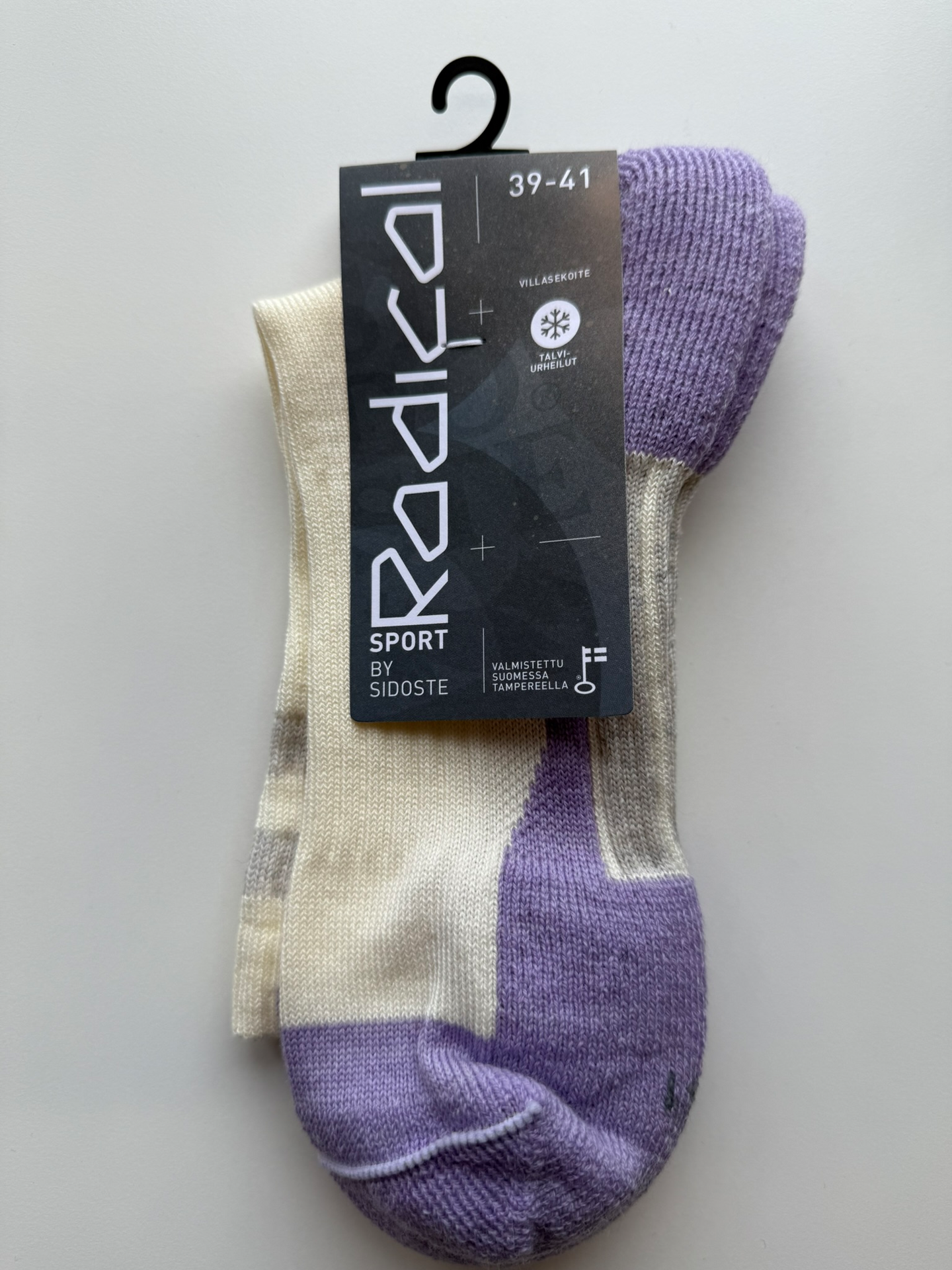 Sidosteen radical sport naisten urheilusukka ulkoiluun ja vapaa-aikaan. Pohja merinovillaa. Väri valkoinen/lila. Varren pituus 17 cm