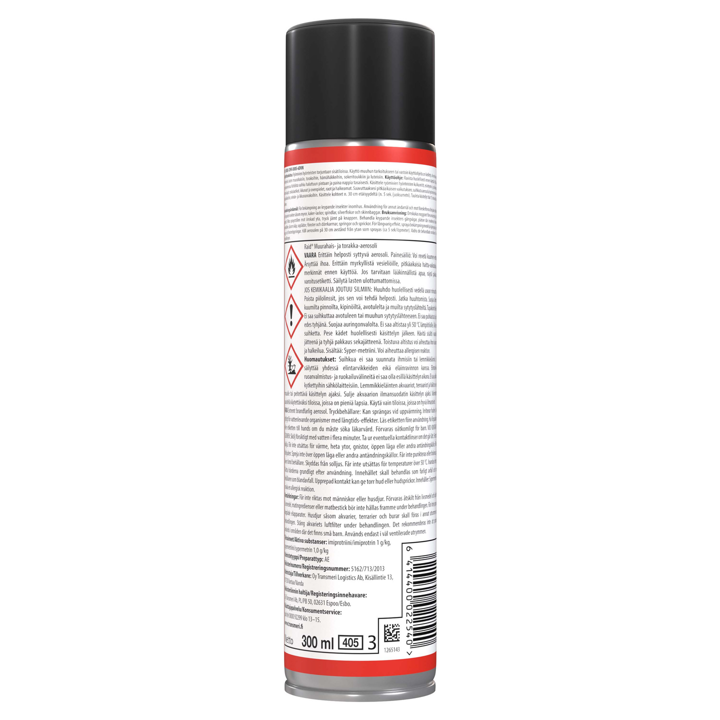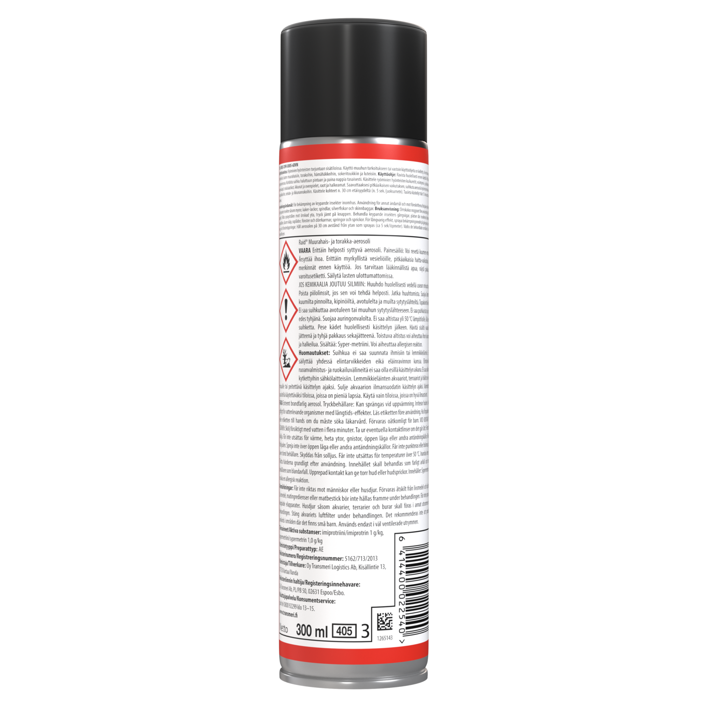 Raid muurahais- ja torakka-aerosoli sopii erityisen hyvin ryömiville hyönteisille, kuten muurahaisille. Aerosolin teho säilyy käsitellyllä pinnalla pitkään; jopa 4 viikon ajan. Tuote tehoaa kosketuksesta. Muurahaisten ja torakoiden lisäksi tuote sopii hyvin niiden munien ja esimerkiksi sokeritoukkien torjuntaan. Riittoisa pakkaus on valmistettu Suomessa ja sille on myönnetty Avainlippu-merkki. Käytä biosideja turvallisesti. Lue aina merkinnät ja valmistetiedot ennen käyttöä. Käytä biosideja turvallisesti. Lue aina merkinnät ja valmistetiedot ennen käyttöä.