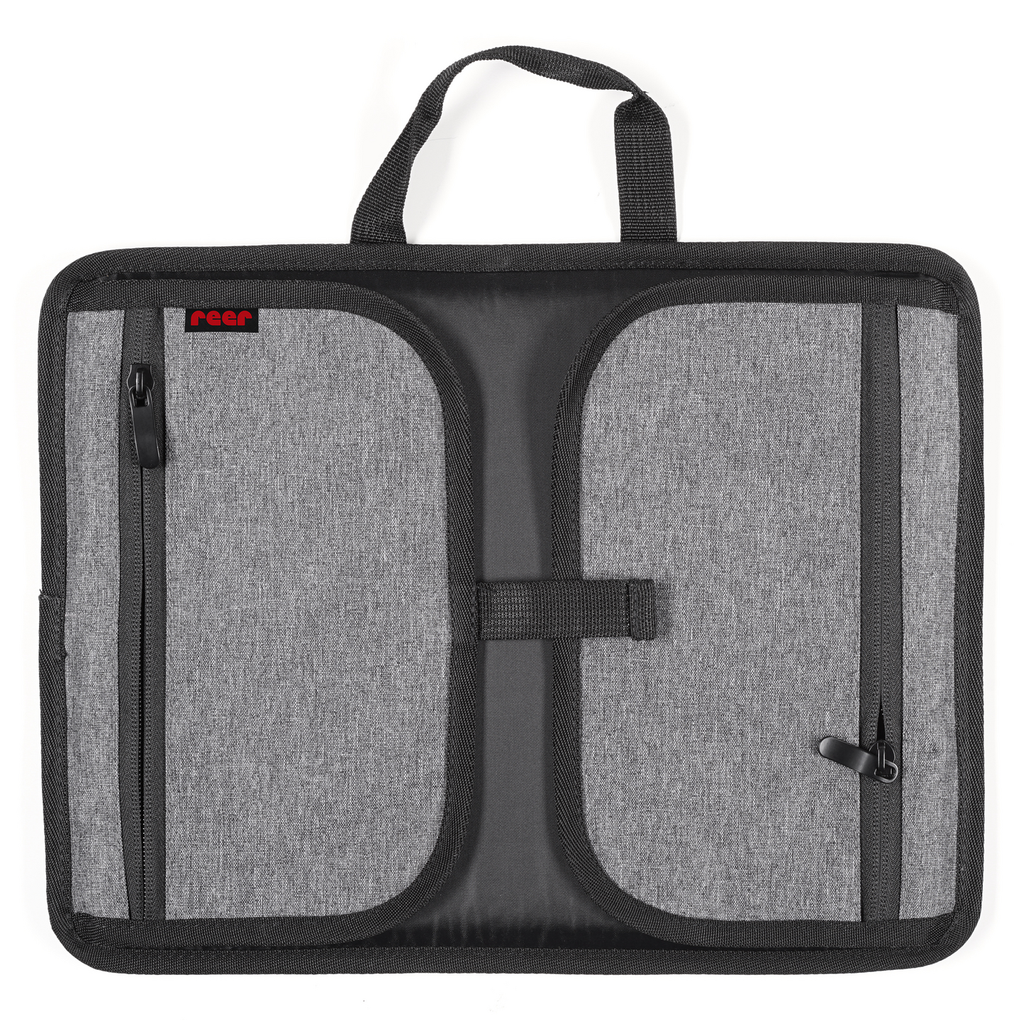 Hauskuutta ja pelejä matkalla Pitkät automatkat voivat joskus olla todella stressaavia sekä vanhemmille että lapsille. Pitkään paikallaan istuminen ja maisemien yksitoikkoisuus tarkoittavat, että lapsesi kyllästyvät nopeasti. He eivät halua enää istua paikoillaan, vaan sen sijaan haluavat olla toiminnassa - ihanteellisesti pelaamalla pelejä tai piirtämällä. TravelKid Play piirustus- ja pelialusta mahdollistaa lapsesi piirtämisen ja pelaamisen helposti myös tien päällä, tehden tylsistä autoreissuista hauskoja. Ihanteellinen matkalla Jopa pitkillä autoreissuilla, esimerkiksi lomamatkalla, lapset rakastavat luovia aktiviteetteja. TravelKid Play on tukeva polvialusta, joka soveltuu paitsi piirustusalustaksi, myös pelien ja kaikkien muiden toimintojen pohjaksi, joihin tarvitaan pöytää. Samalla alustan kulmissa olevat joustavat kiinnitysnauhat tarjoavat tukevan pidon piirustusalustalle tai pelilaudalle ja estävät liukumisen. Sen likaa ja vettä hylkivän materiaalin ansiosta alusta on helppo puhdistaa. Tämä tarkoittaa, että ei ole myöskään ongelma, jos lapsesi kaataa juomansa silloin tällöin. Käytännölliset taskut Piirustusalustassa on 2 suurta taskua kummallakin sivusiivellä. Nämä tarjoavat käytännöllistä säilytystilaa peleille tai paperille ja kynille. Taskujen vetoketjukiinnitysten ansiosta kaikki pysyy turvallisesti paikoillaan. Voit siis rentoutua ja keskittyä ajamiseen, tietäen että lapsellasi on kaikki tarvittava leikkiin, valmiina käden ulottuvilla milloin tahansa. Tämä tekee autoreissuista parempia koko perheelle. Käytännöllinen mukaanotettava Matkustaessasi lapsesi kanssa, ei autossa, vaan muulla kulkuneuvolla, kuten bussilla, junalla tai lentokoneella, heidän ei tarvitse luopua TravelKid Playstaan. Sivuosat voidaan sulkea keskeltä soljella, suojaten paperit putoamiselta tai likaantumiselta. Pelit pienine palasineen ja kynät säilytetään turvallisesti sivutaskuissa. Kahvan ansiosta alustan voi mukavasti kantaa kädessä. - vakaa alusta piirtämiseen ja pelaamiseen - pelejä ja hauskuutta matkoilla - ihanteellinen pitkille autoreissuille ja lomamatkoille - käytännölliset taskut säilytykseen, esim. kynille - helppo puhdistaa vettä ja likaa hylkivän materiaalinsa ansiosta - suuri piirustuspinta: 24 x 36 cm