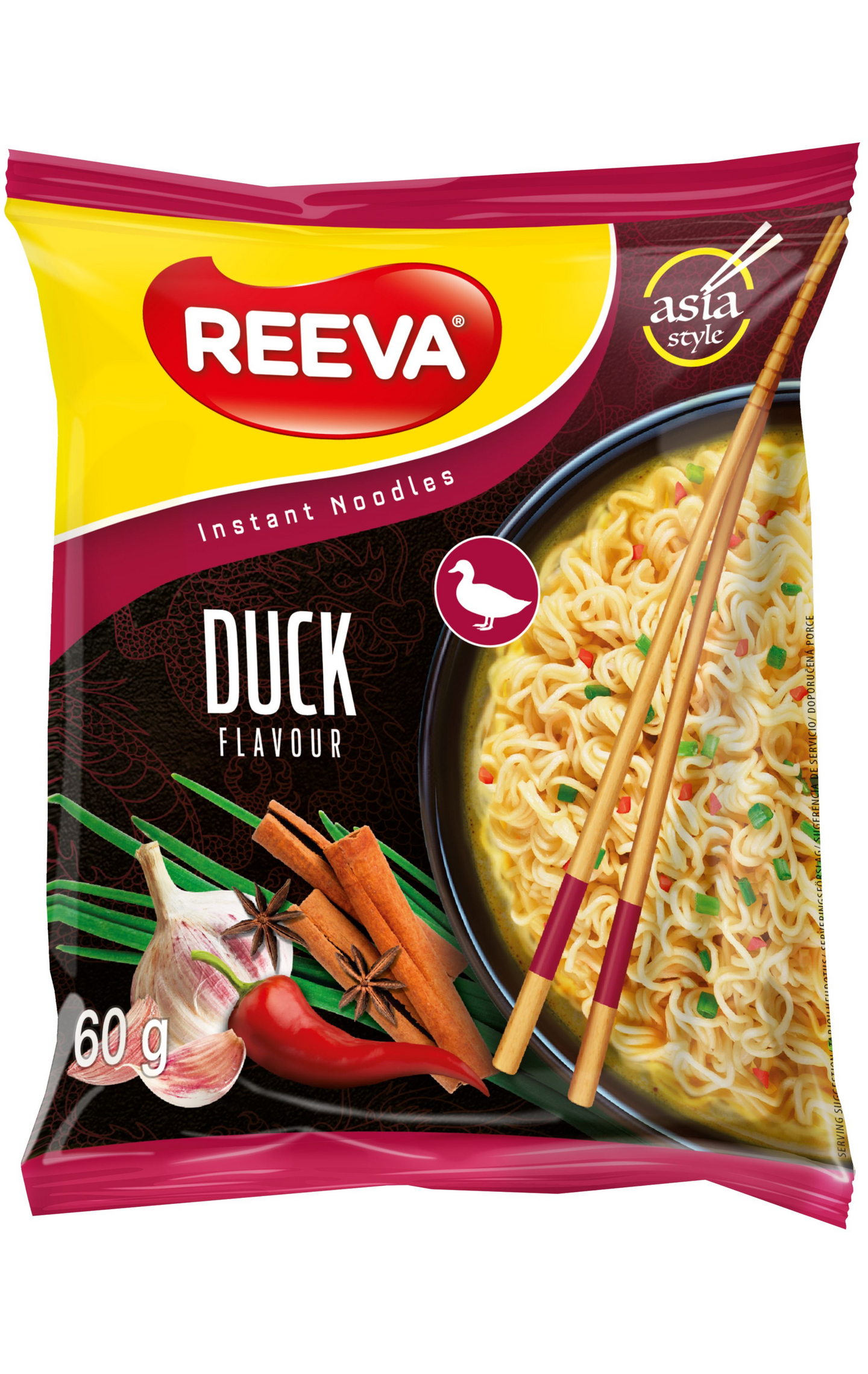 Reeva Asian Style ankanmakuinen vehnänuudeli kerta-annospussissa. Pikanuudelit Aasian tyyliin erottuvat perinteisistä Reeva nuudeleista hieman mausteisemmalla maullaan sekä makuvalikoimallaan. Reeva panostaa aitoihin ja täyteläisiin makuihin käyttäen luonnollisia kasviksia ja mausteita. Maukas ja nopea nuudeliannos on helppo ottaa mukaan harrastuksiin, töihin tai retkille. Valmista vain viidessä minuutissa – kaada kuppiin kiehuva vesi, anna hautua ja sekoita. Voit lisätä joukkoon haluamasi lisukkeen tai lisätä nuudelit wokkeihin, salaatteihin tai keittoihin, tai nauttia ne sellaisenaan. Nuudelit sopivat hyvin lounaaksi tai välipalaksi. Kokeile myös muita Reeva nuudeli makuja!