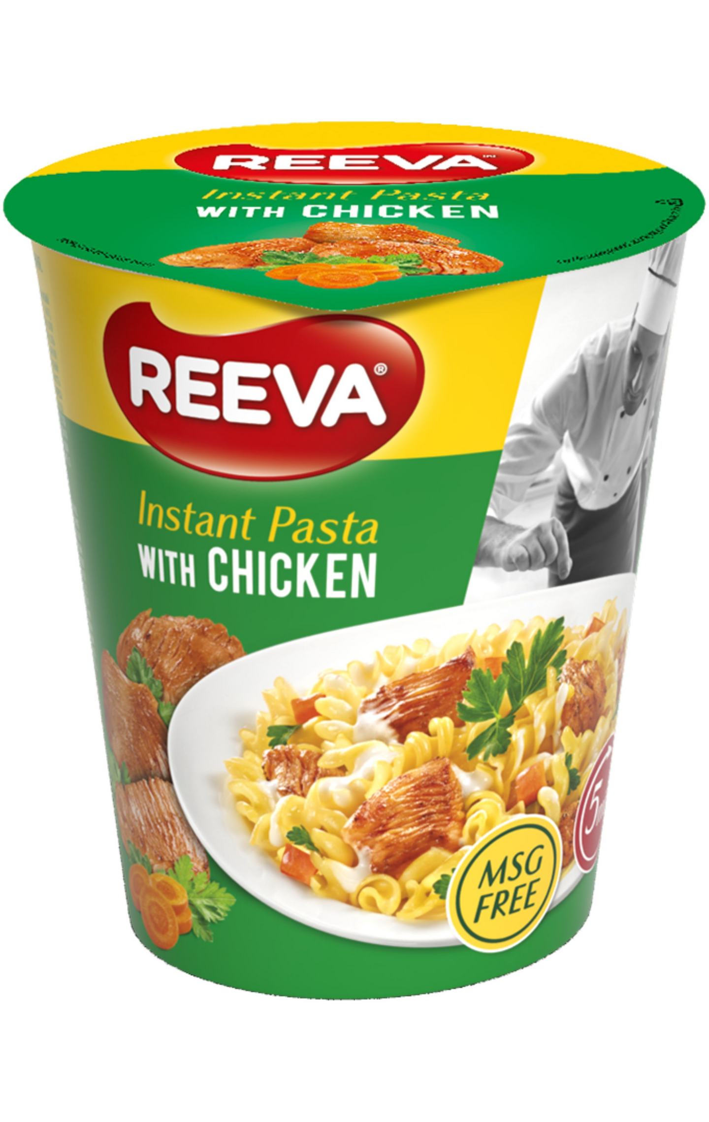 Kananmakuinen pikapasta-ateria kätevässä kupissa. Maukas ja täyteläinen pasta-annos on helppo ottaa mukaan harrastuksiin, töihin tai retkille. Valmista vain viidessä minuutissa – kaada kuppiin kiehuva vesi, anna hautua ja sekoita. Pikapasta sopii hyvin lounaaksi tai välipalaksi. Kokeile myös muita Reeva pikapasta- makuja!