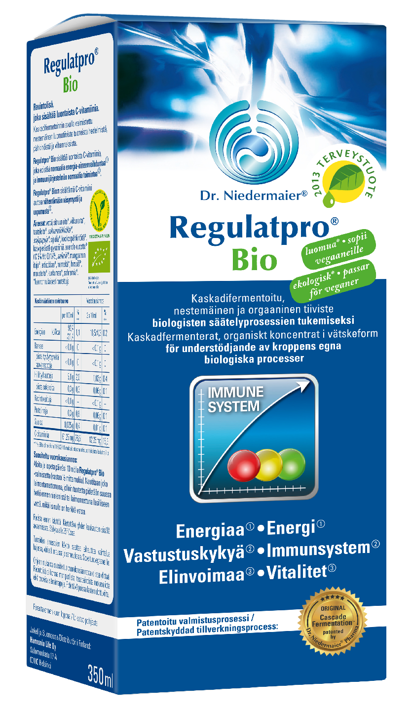 Vastustuskykyä hapattamalla valmistetusta entsyymijuomasta. Regulat on luomuvihanneksista -pähkinöistä ja -hedelmistä patentoidulla kaskadifermentointimenelmällä (vaihekäyttämismenetelmällä) valmistettu entsyymijuoma. Sisältää C-vitamiinia, joka auttaa vähentämään väsymystä ja uupumusta sekä edistää immuunijärjestelmän normaalia toimintaa. Sopii kasvisruokavaliota noudattaville. Regulatpro® Bio valmistuksen taustalla on monivaiheinen käyttämismenetelmä: original ”Cascade Fermentation ”. Kaskadifermentointi (Cascade fermentation™) on ainutlaatuinen*, useista peräkkäisistä käymisvaiheista koostuva prosessi, jonka edetessä huolella valittu* hedelmien, vihannesten ja pähkinöiden seos hajoaa pieniksi osasiksi. Seosta fermentoidaan usean viikon ajan maitohappokäymisen (L+ -maitohappo) avulla, jonka useiden eri vaiheiden aikana lähtöaineet hajoavat pieniksi osasiksi. Kaskadifermentoinnin aikana kasvisten sekundaariset ainesosat (polyfenolit) erittyvät prosessissa syntyviin maitohappobakteereihin (L+ -maitohappoon). Samalla entsyymit ja muut proteiinit pilkkoutuvat pienemmiksi. Tämä ainutlaatuinen menetelmä takaa sen, että lopullinen Regulatpro® Bio -tiiviste sisältää kaikki lähtöaineiden sisältämät ravintoaineet tiivistetyssä olomuodossa.