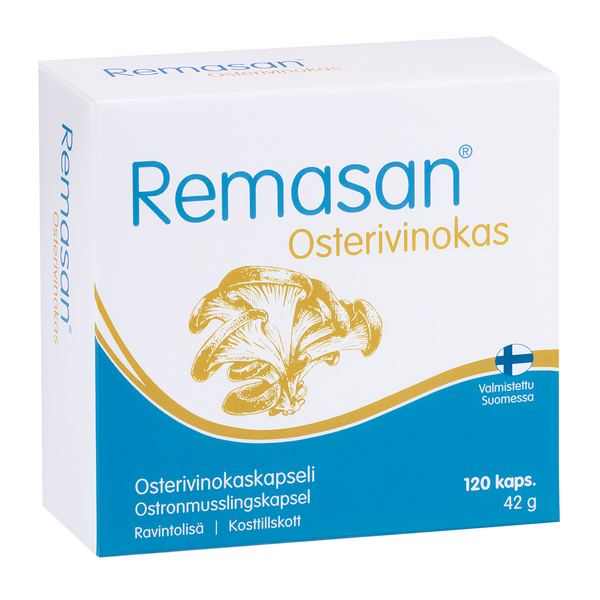 Remasan-kapselit sisältävät 254 mg/kapseli erikoisviljeltyä, tarkkojen tutkimusten perusteella valittua ja pitkälle jalostettua RPO–2 osterivinokaskantaa (Pleurotus ostreatus), jonka tuottamat sille ominaiset polysakkaridit ja glykoproteiinit tukevat elimistön hyvinvointia. Tasapainoisen koostumuksensa ansiosta osterivinokas on monipuolinen ravintolisä. Annostus: Aikuiset: 2 kapselia 3 kertaa päivässä. Lapset: 2-6 v. 1 kapseli 2 kertaa päivässä, 7-12 v. 1 kapseli 3 kertaa päivässä, yli 12-v. 2 kapselia 2-3 kertaa päivässä.Kapselin voi halutessaan avata ja käyttää sisällön sellaisenaan tai sekoittaa ruokaan. Laktoositon, hiivaton, makeuttamaton, gluteeniton. Valmistettu Suomessa.
