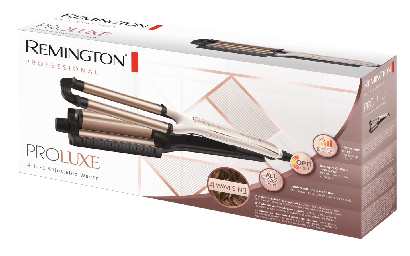 Säädettävä lainerauta jolla luot 4 erilaista tyyliä. Haluat sitten rennot beach-laineet, huolettoman kevyet lainekiharat, merenneidon laineet tai suuret laineet, kaikki onnistuu todella helposti. Optiheat-teknologia takaa aina 24 tuntia kestävän muotoilutuloksen. Keraaminen grippi-pinnoite pitää hiukset hyvin paikoillaan muotoilun aikana. Digitaalinen lämpötilan säätö, 5 vaihtoehtoa, jopa 210°C. Soveltuu kaikille hiuslaaduille. Kun näytöllä on PRO+, on lämpötila ideaali 185°C. Erittäin nopeasti käyttövalmis, vain 30 sekunnissa. Lämpötilan voi lukita. Laineraudan kärkiosa pysyy viileänä. Automaattinen virrankatkaisu 60 min kuluttua. Lukitus kuljetuksen ja säilytyksen ajaksi.