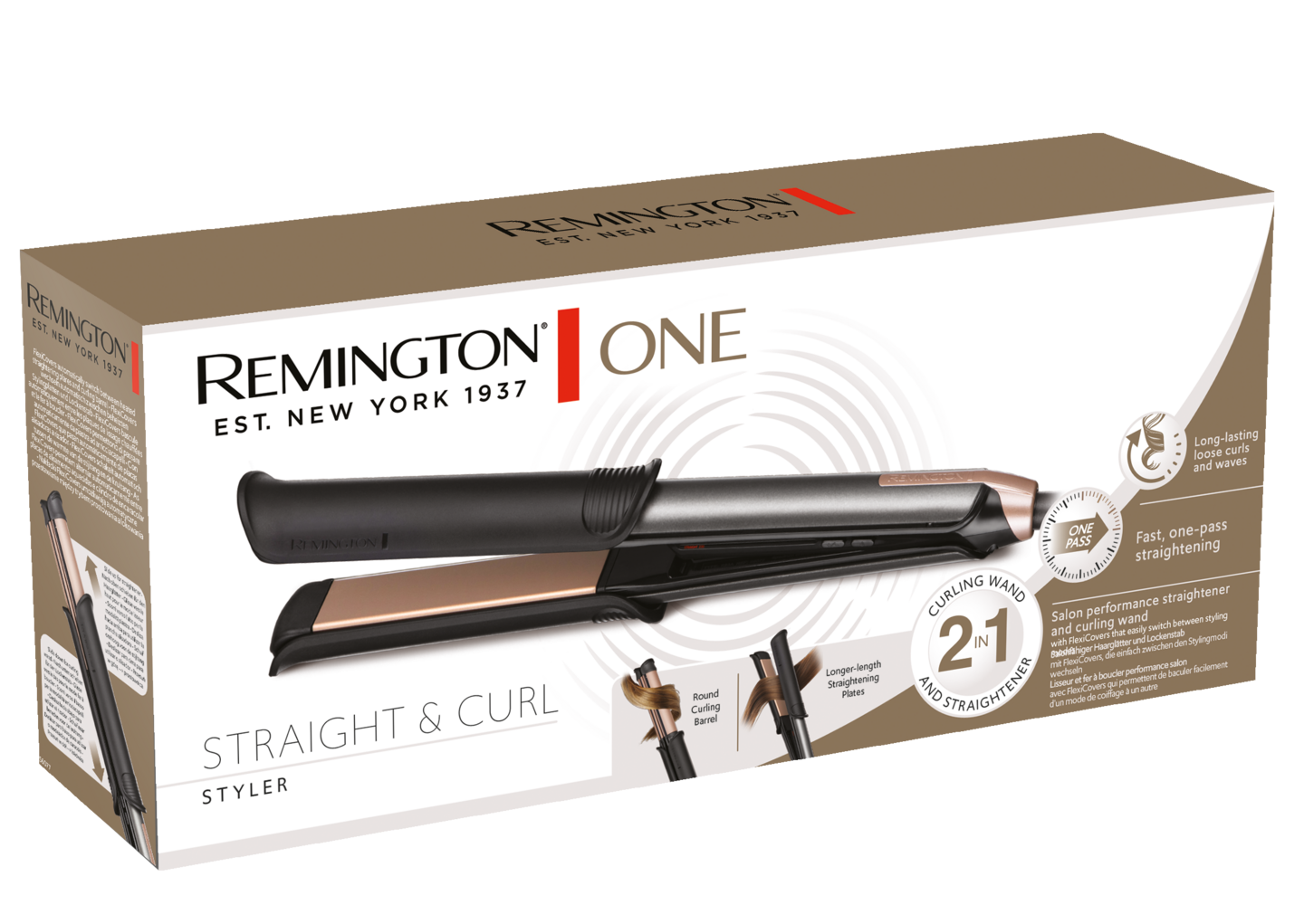 Remington ONE Straight & Curl Styler on ammattimainen suoristusrauta ja sauvakiharrin yhdessä laitteessa. Voit luoda sillä helposti monipuolisia suoria tai kiharia hiustyylejä.